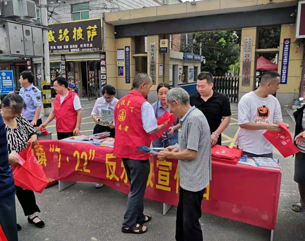 7月22日上午,阜阳市颍东区老庙镇组织平安办、派出所、司法所、社保所、妇联等部门人员在镇西大街联合开展“7.22”反邪教宣传日活动。