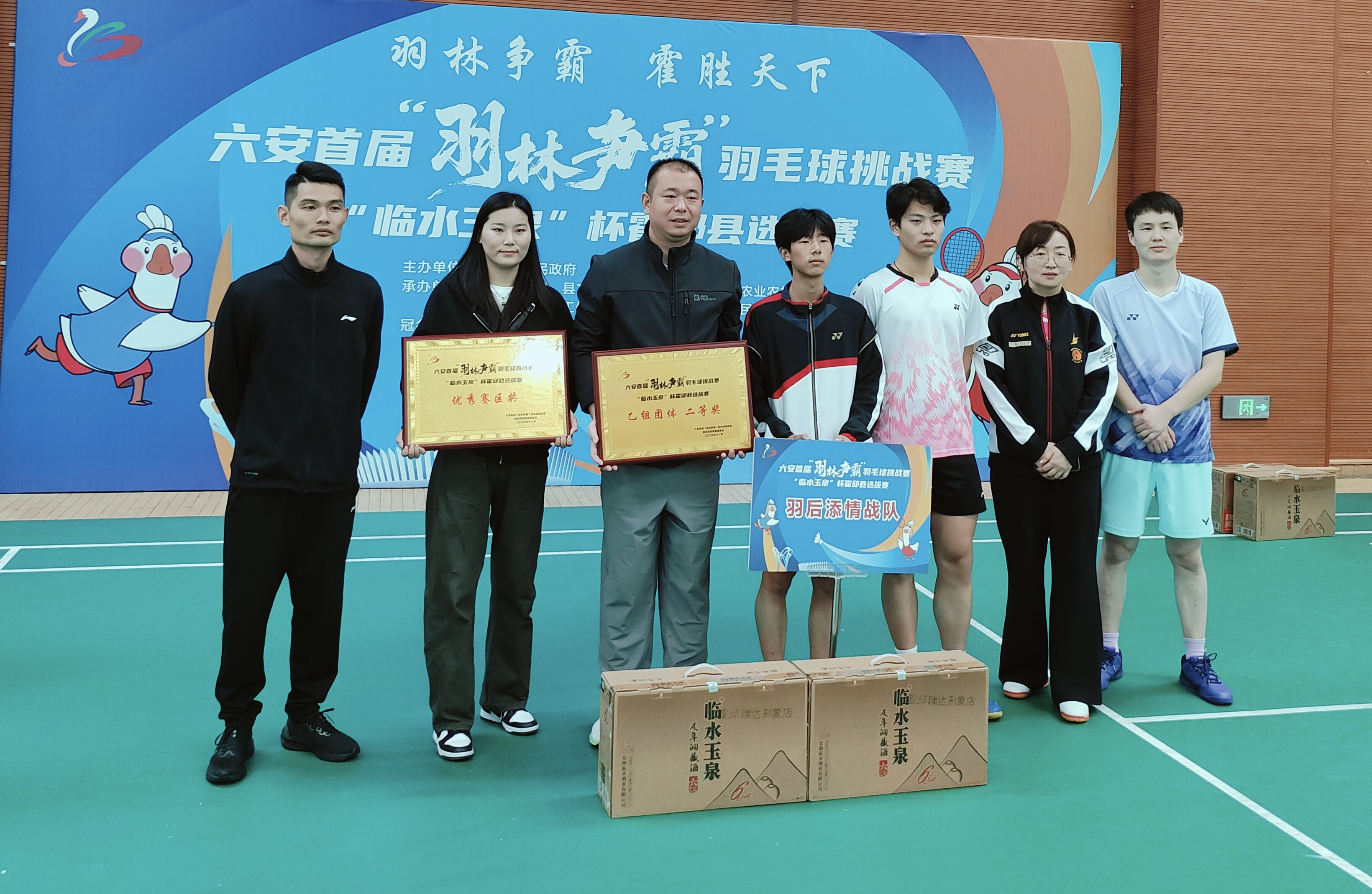 近日,霍邱县宋店镇男羽毛球选手(左)所在的五队获得县乙组团体二等奖。