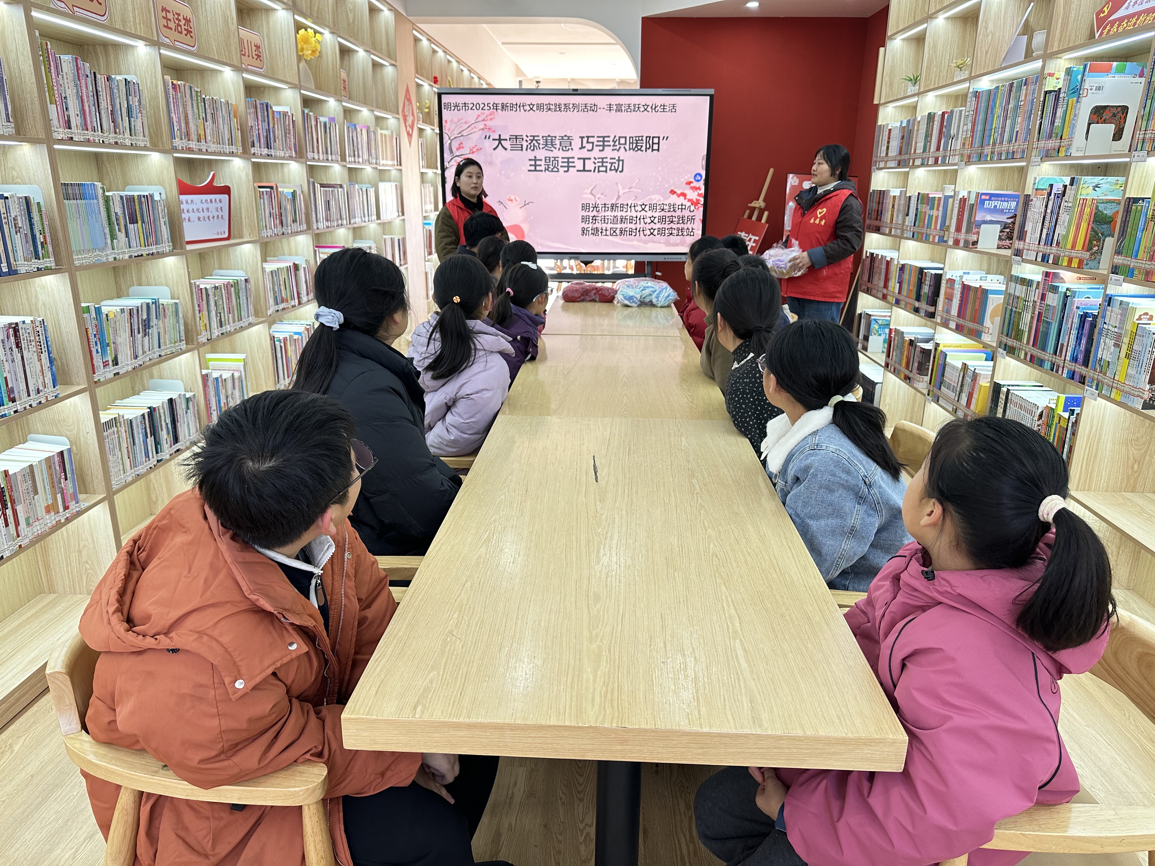 为传承中华优秀传统文化,丰富辖区青少年课余生活,12月7日下午,明光市明东街道新塘社区新时代文明实践站联合农家书屋开展了“大雪添寒意 巧手织暖阳”主题手工活动。