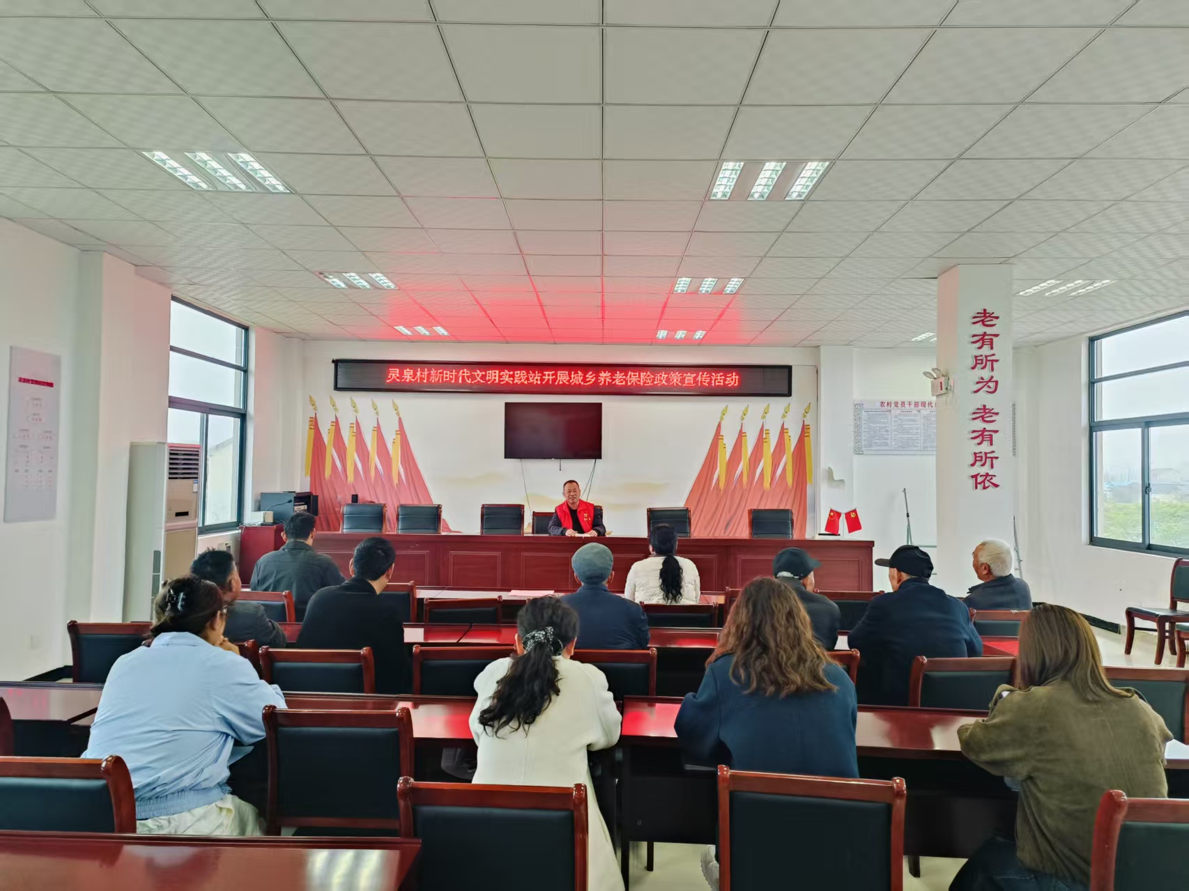 近日,凤阳县武店镇灵泉村新时代文明实践站开展城乡居民养老保险政策宣传活动,旨在提升群众社保政策知晓度,增强参保续保缴费意识,确保辖区内居民应保尽保,共享惠民政策。