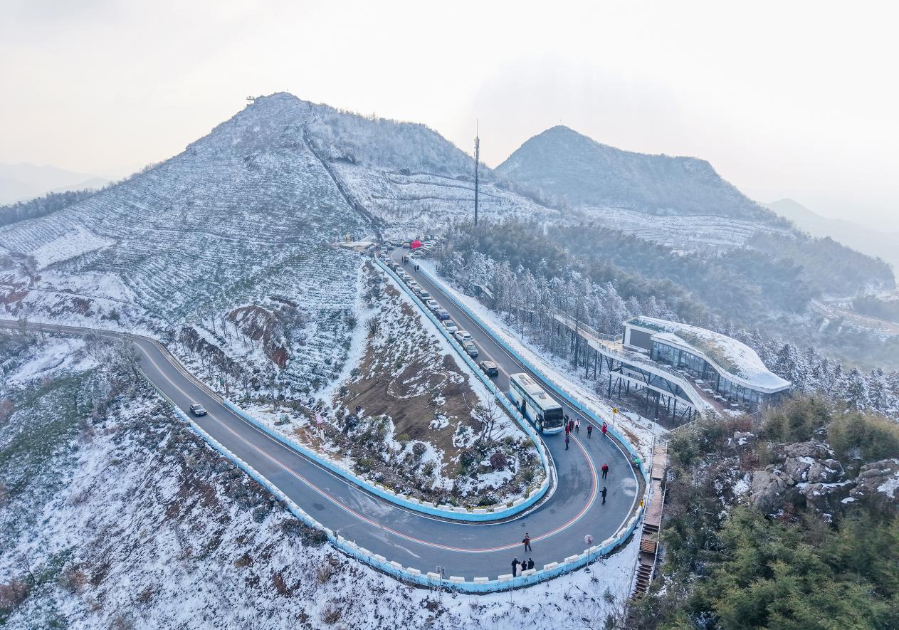 2026年1月2日,庐江县境内的寨基山迎来新年首场降雪。吸引众多游客和摄影爱好者前来登山赏雪、打卡留念。