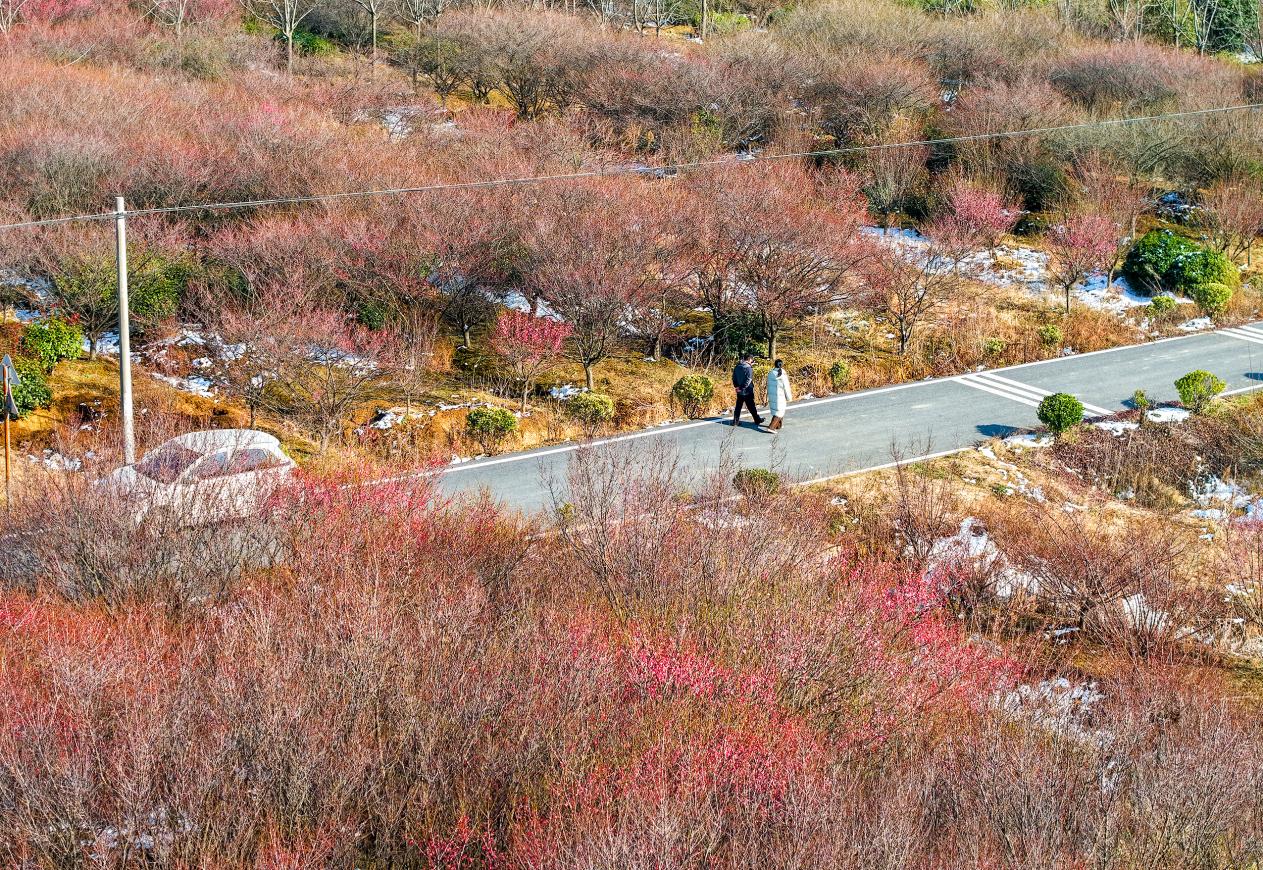 近日,庐江县白湖镇六岗梅园,雪后梅花绽放吸引游客前来观赏。