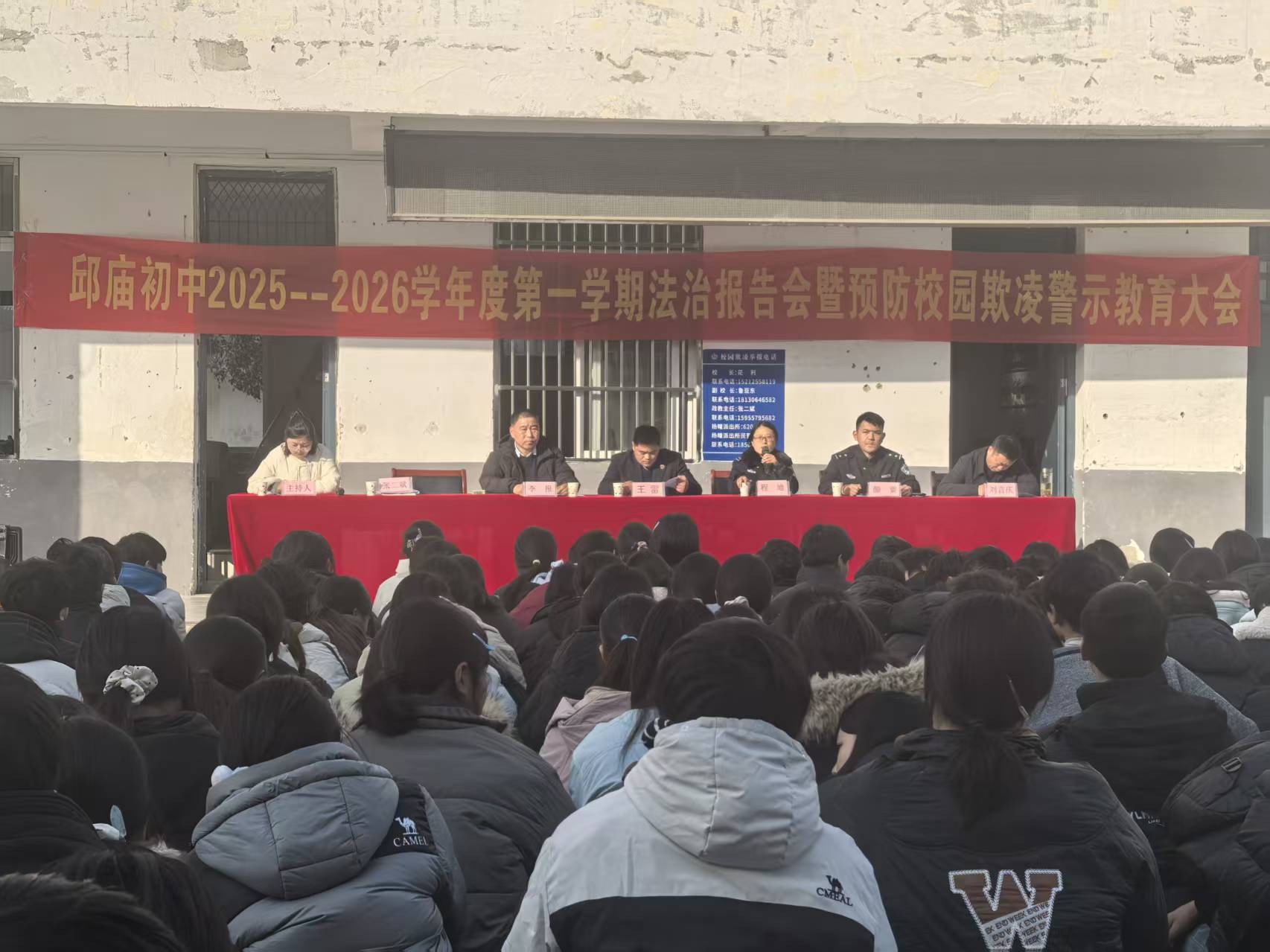 1月15日,灵璧县司法局杨疃司法所联合派出所等部门,在邱庙中学举办专题法治报告会暨预防校园欺凌警示教育大会。