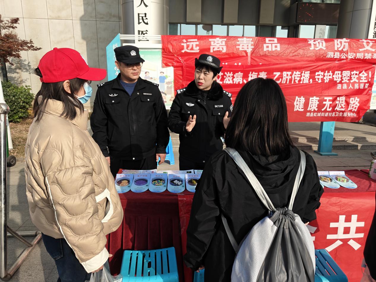 近日,泗县公安局禁毒大队联合县卫健委、县疾病预防控制中心等单位,在泗县人民医院广场开展禁毒防艾主题宣传活动,推动禁毒与防艾工作深度融合,为群众送上一份实用的“健康安全礼”。