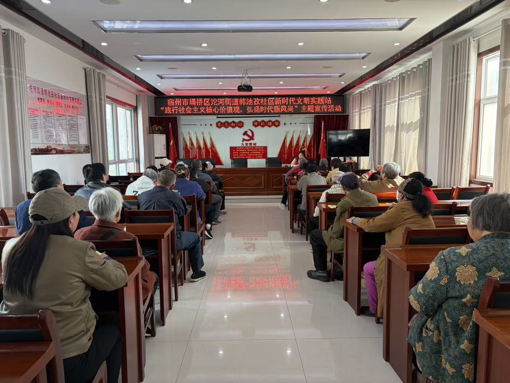 近日,宿州市埇桥区沱河街道韩池孜社区新时代文明实践站围绕“践行社会主义核心价值观,弘扬时代新风尚”主题,组织开展宣传活动,旨在引导居民将核心价值观内化于心、外化于行。