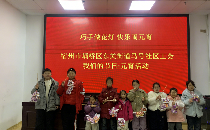 3月3日,宿州市埇桥区东关街道马号社区工会举办“巧手做花灯快乐闹元宵”主题活动,邀请快递员、外卖骑手、网约车司机等新就业群体子女欢聚一堂,共度温馨佳节。