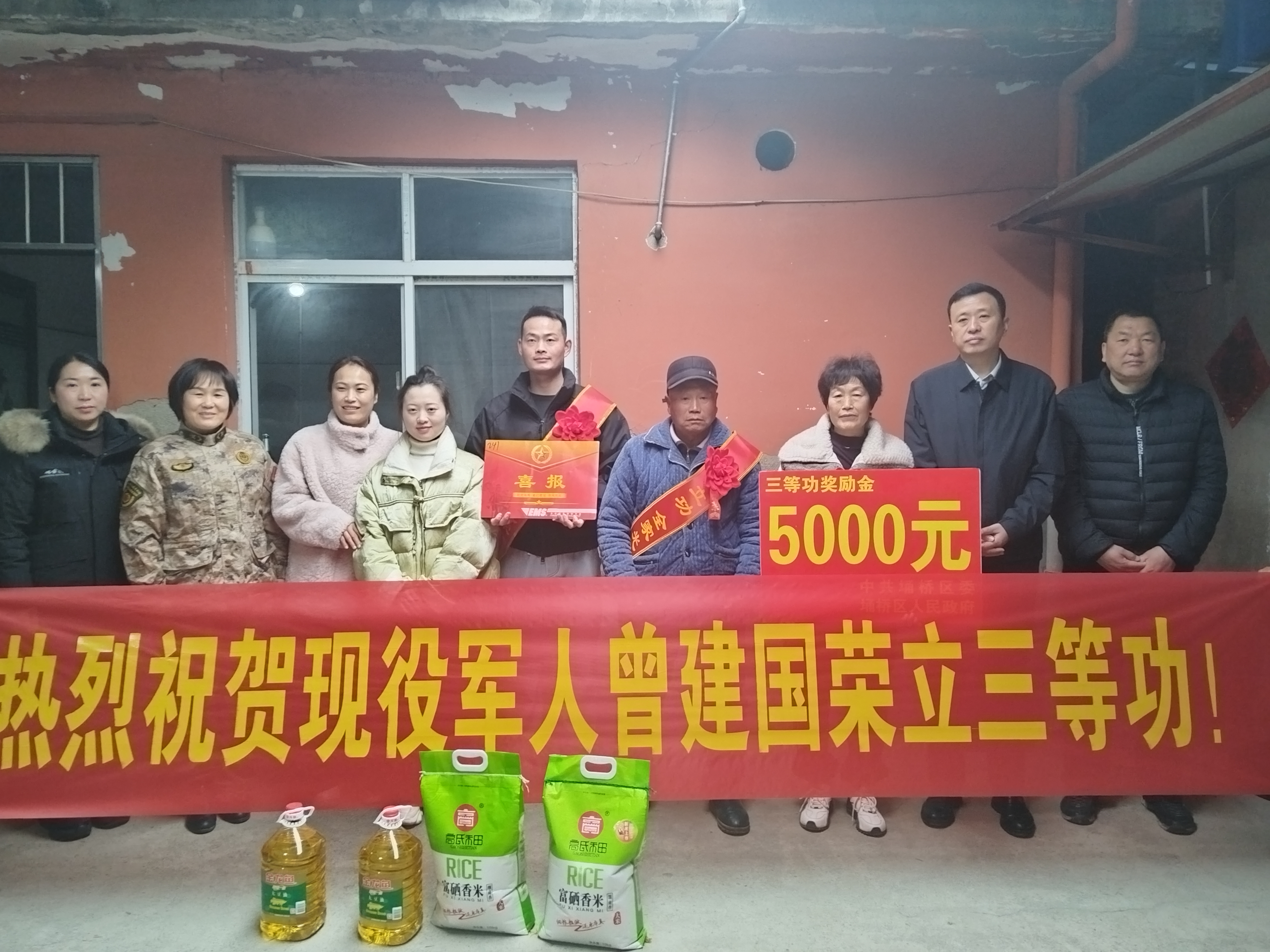 2月25日上午,宿州市埇桥区城东街道党工委书记王征、武装部长刘静和工作人员一行,前往在部队荣立三等功表彰的军人曾建国家中,为他们送去立功喜报和慰问品,共同分享荣光。