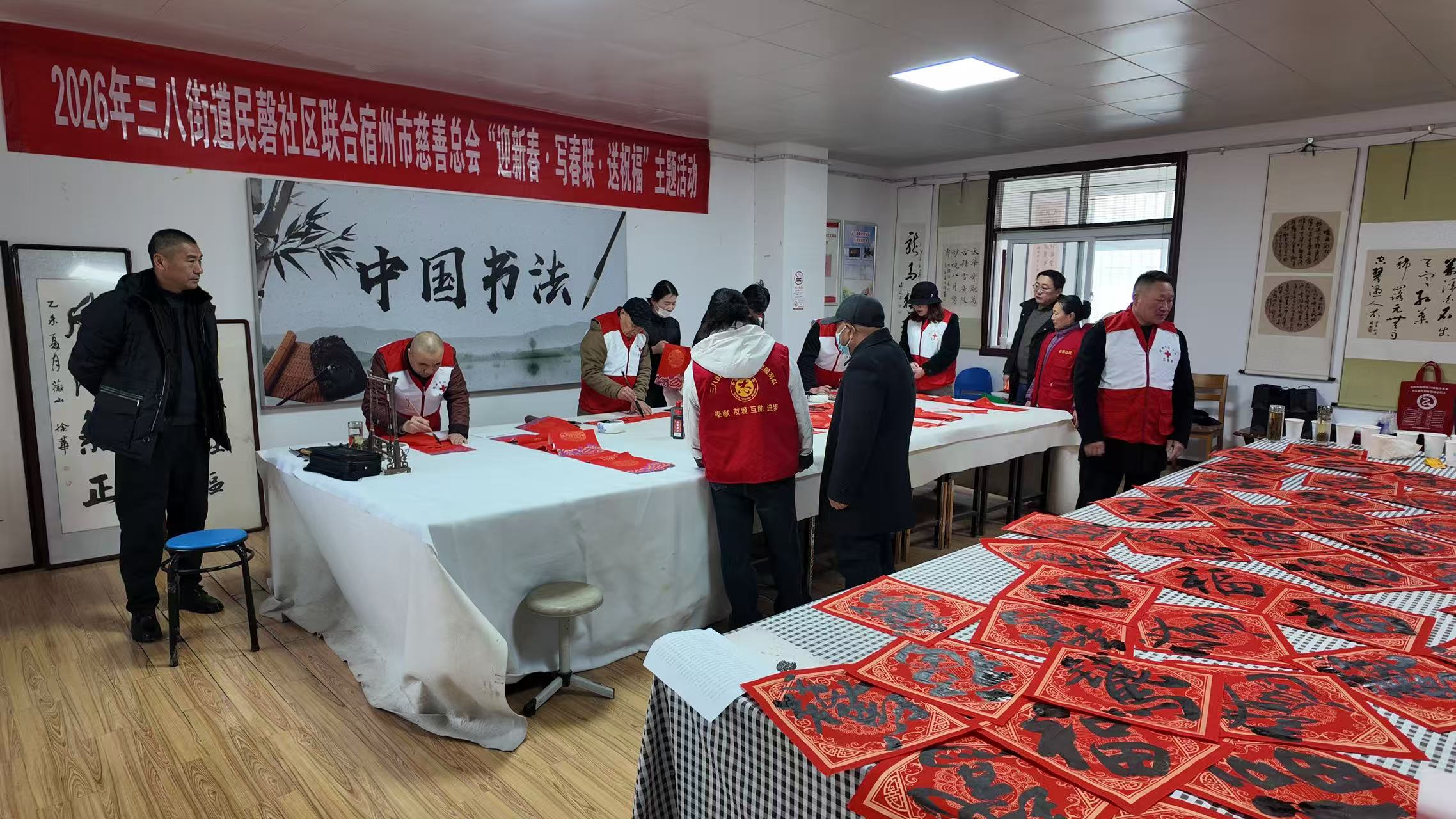 2月5日,宿州市埇桥区三八街道民磬社区喜气洋洋,热闹非凡。宿州市红十字志愿服务队联袂宿州市慈善总会,正在这里开展义务写春联、送春福活动,将新春祝福送到社区千家万户。