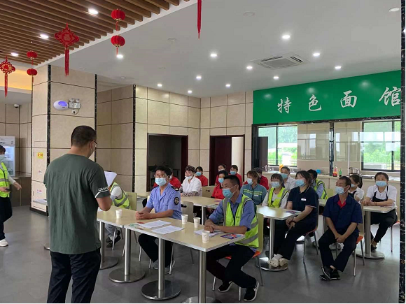 夏季来临,为提高食品安全事故预警、应急响应等各项能力,让安全意识牢记心间,长丰县杜集镇联合辖区安徽省驿达高速公路服务区经营管理有限公司,在高速服务区食堂开展食品安全事故应急演练。