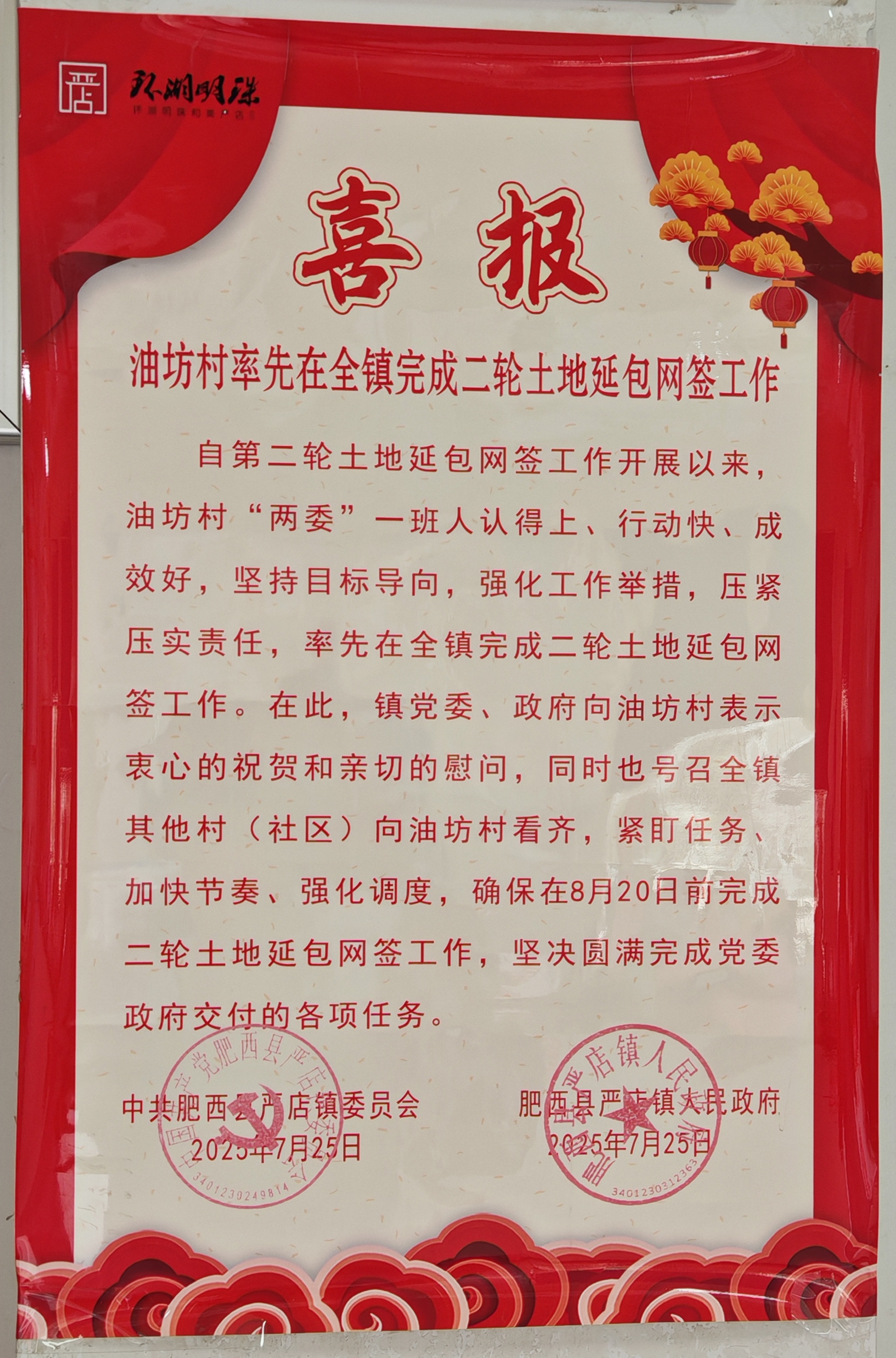 近日,肥西县严店镇油坊村因率先在全镇完成二轮土地延包网签工作,收到镇党委发出的喜报。这一成效正是油坊村党支部书记马祥带领村两委班子积极借鉴先进地区经验、践行“五比五拼”工作机制的有效成果。