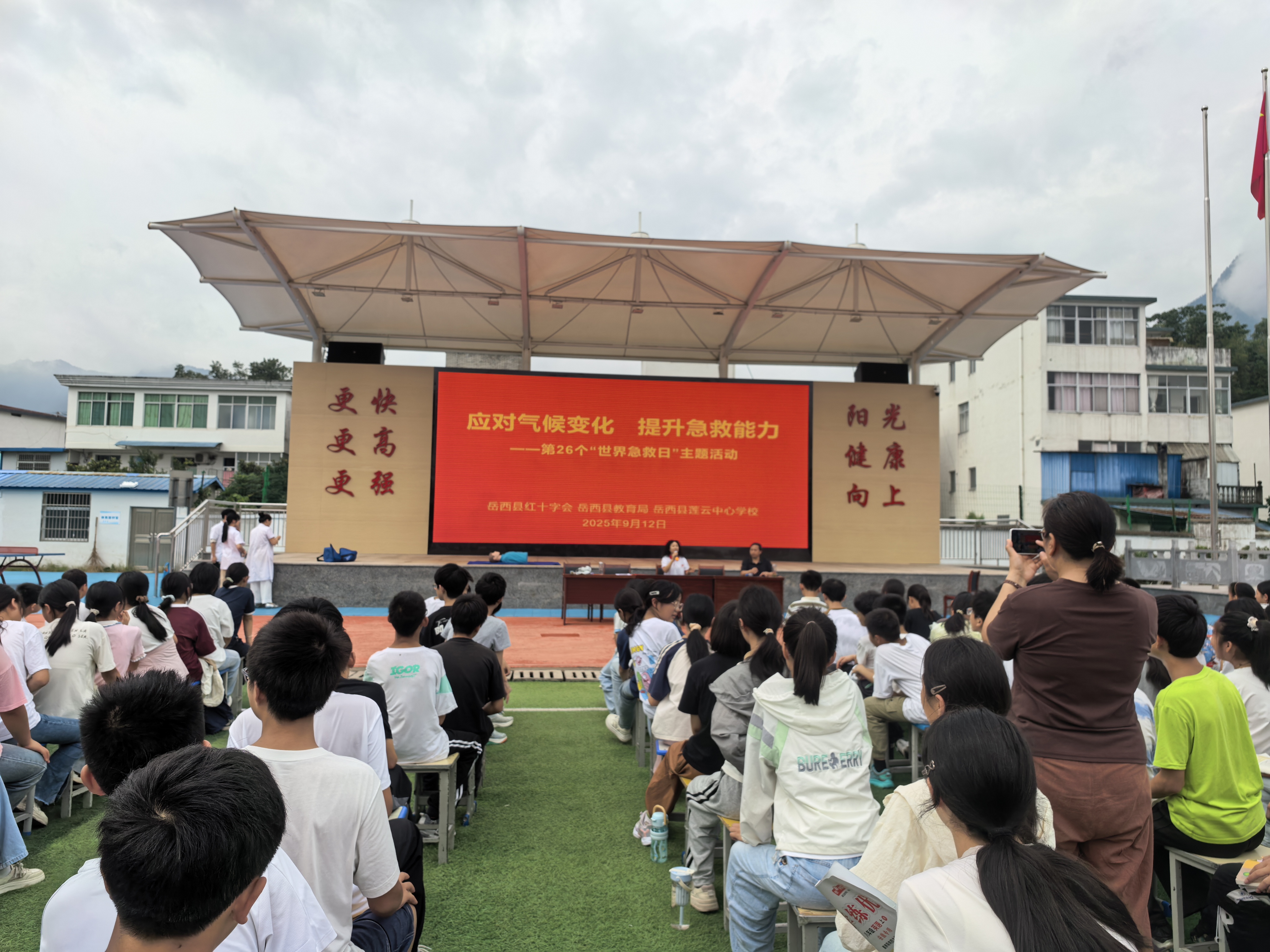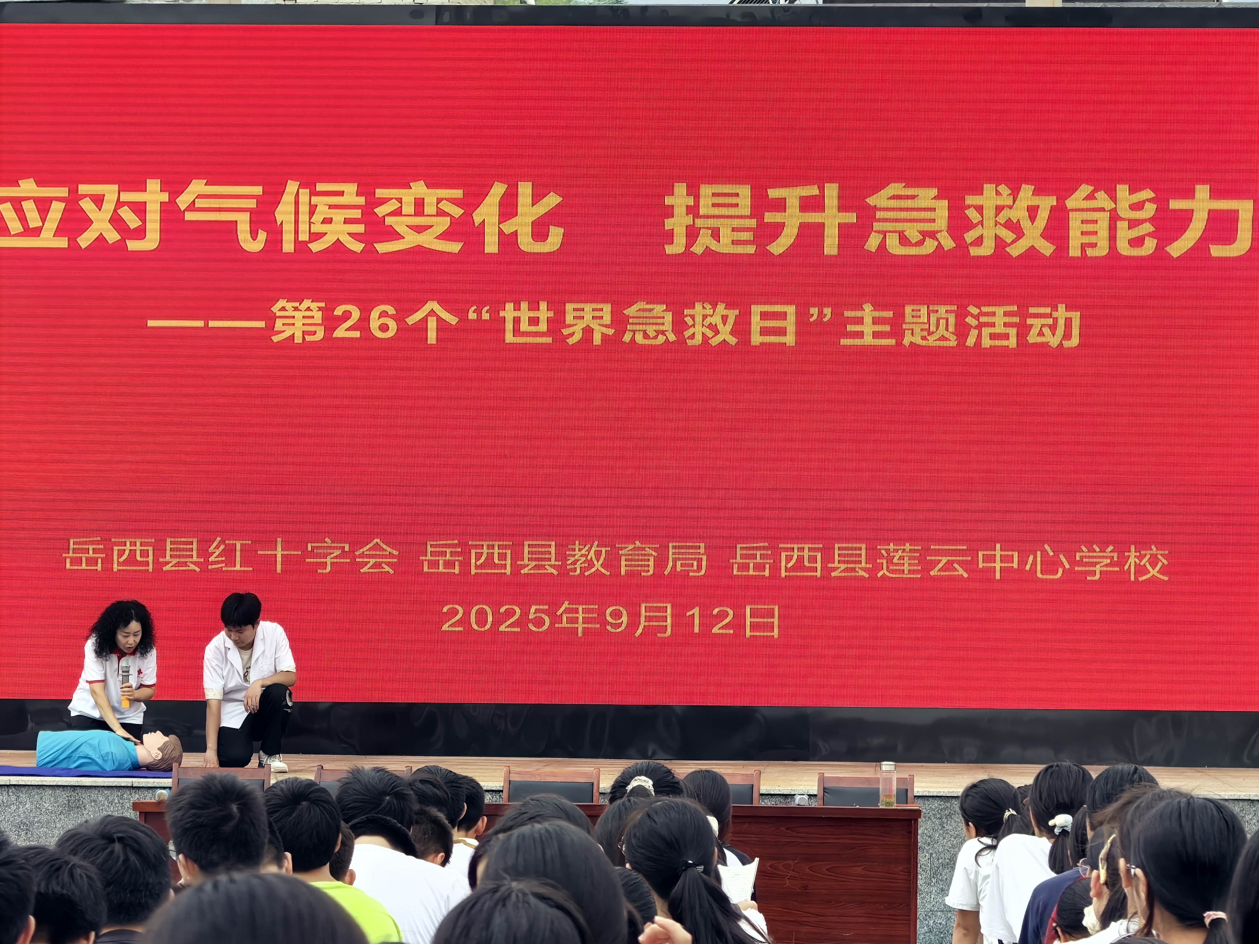 9月12日上午,岳西县红十字会联合县教育局在莲云中心学校开展以“急救与气候变化”为主题的第26个“世界急救日”主题宣传活动,800余名师生参加。