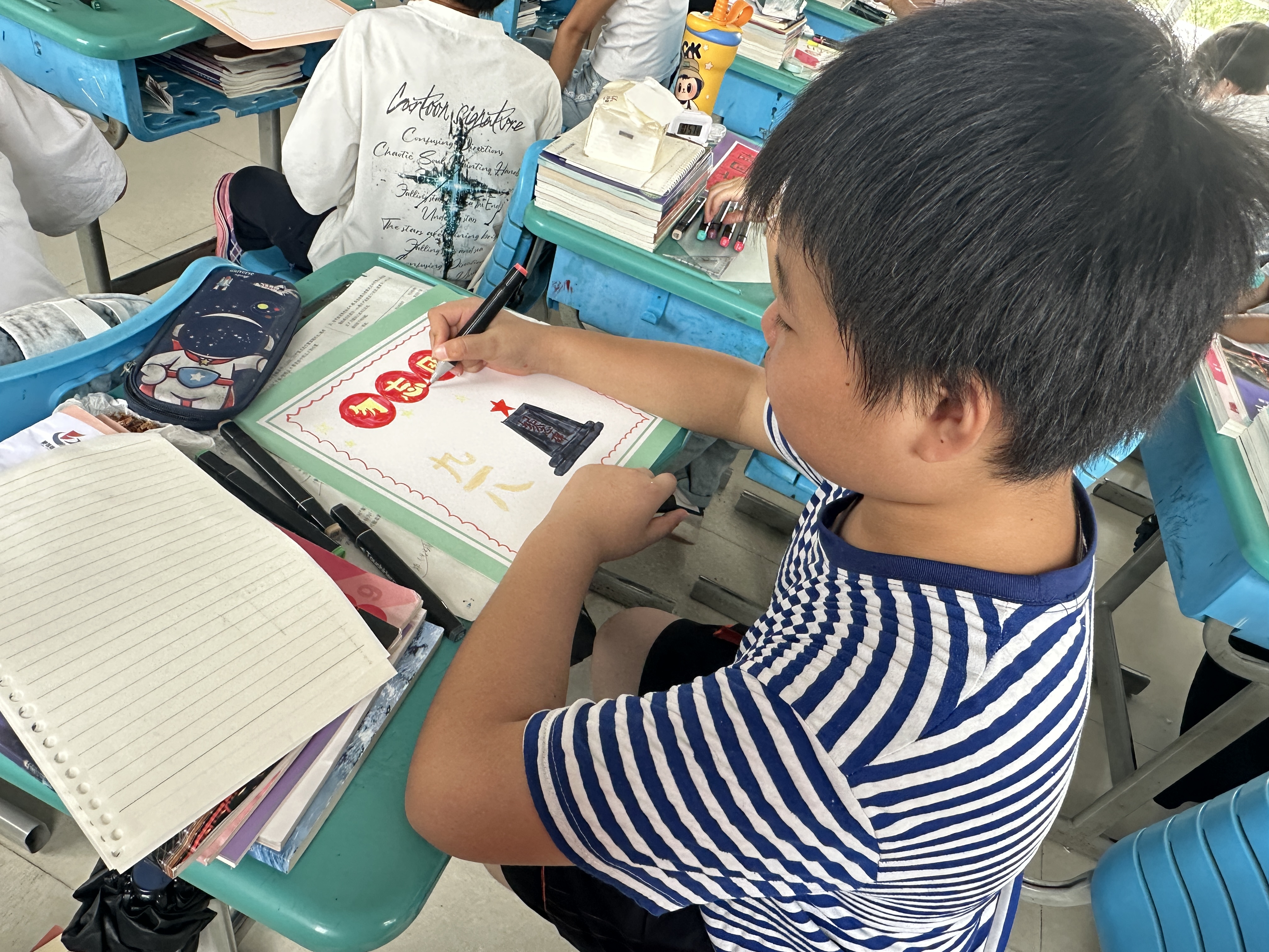 随后的九一八主题手抄报DIY环节,现场氛围热烈。青少年们手持画笔、彩纸,以“铭记九一八”为核心主题,将对历史的铭记、对祖国的热爱融入作品之中。有的同学绘制了“警钟长鸣”的图案,提醒大家不忘历史;有的同学写下“一寸山河一寸血,吾辈当自强”的标语,传递奋进决心。社工在旁适时指导,鼓励大家大胆创作,让每一幅手抄报都成为承载爱国情感的独特载体。(余红艳)