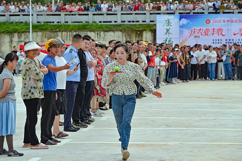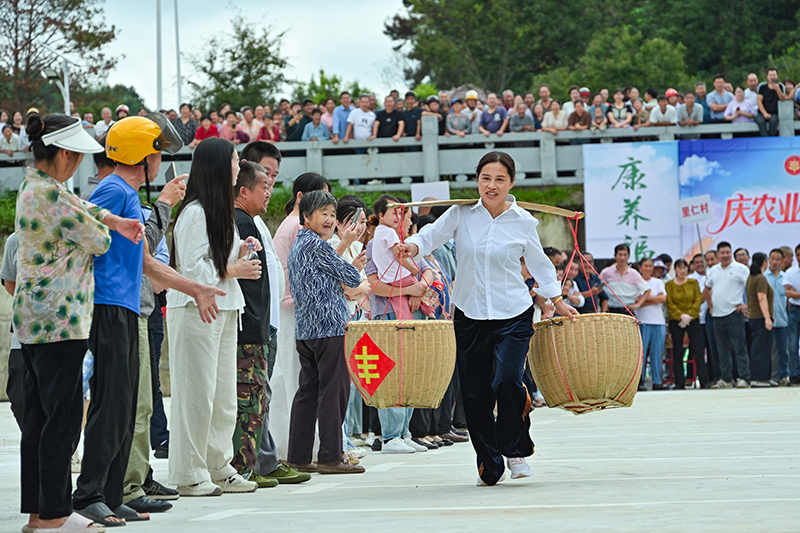在喜庆的文艺节目后,该镇党委副书记、镇长储超宣布比赛正式开始。在首先进行的“抢粮进仓”接力赛中,各村男选手依次上场,肩挑玉米一路小跑,绕一圈往回赶;随后女选手赶紧接过担子,继续跑。在参赛选手中,有的步伐稳健轻松自如,有的踉踉跄跄,引来周边观众欢阵阵呼声。