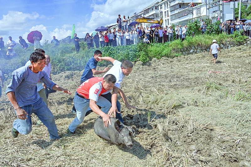 在金秋时节的稻田里“抓猪”比赛,无疑是一场充满欢声笑语的农趣盛宴,这在菖蒲镇是第一次举办,吸引着四面八方的群众早早前来围观。12个村组成三个“抓猪”参赛队,依次上场,谁先抓到猪。猪就是奖品归谁。随着哨声响起,参赛者们便在收割后的一片稻田里,朝着刚刚放进稻田里的一头80斤上下的黑猪,展开饿虎扑食般的围追堵截。现场人跑猪窜,参与者们扑倒、滑跤、合力围堵,周边加油助力的鼓乐声与现场观众的欢笑声交织在一起,将丰收的喜悦推向高潮。最终,成功逮住“猪宝宝”的获胜者往往满身泥泞,但脸上洋溢着最开心的笑容,因为他们获得的战利品,正是对这份智慧、体力与团队协作能力最接地气的褒奖,生动演绎着农耕生活的质朴乐趣。