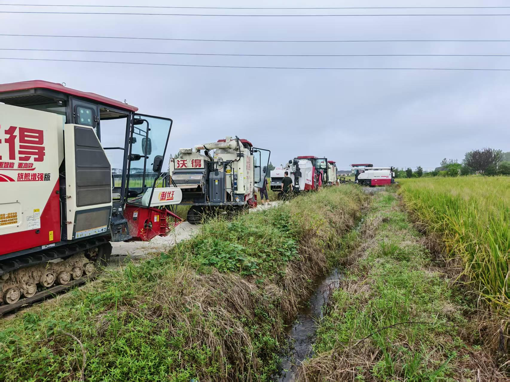 早上9点,随着引擎的轰鸣声由远及近,5辆收割机整齐划一地驶入小中份村民组的田地,宽大的割台缓缓落下,贪婪地“啃”着金黄的稻穗。稻秆被割断的脆响、稻粒碰撞的沙沙声,与机器的轰鸣交织在一起,奏响了一曲激昂的丰收乐章。