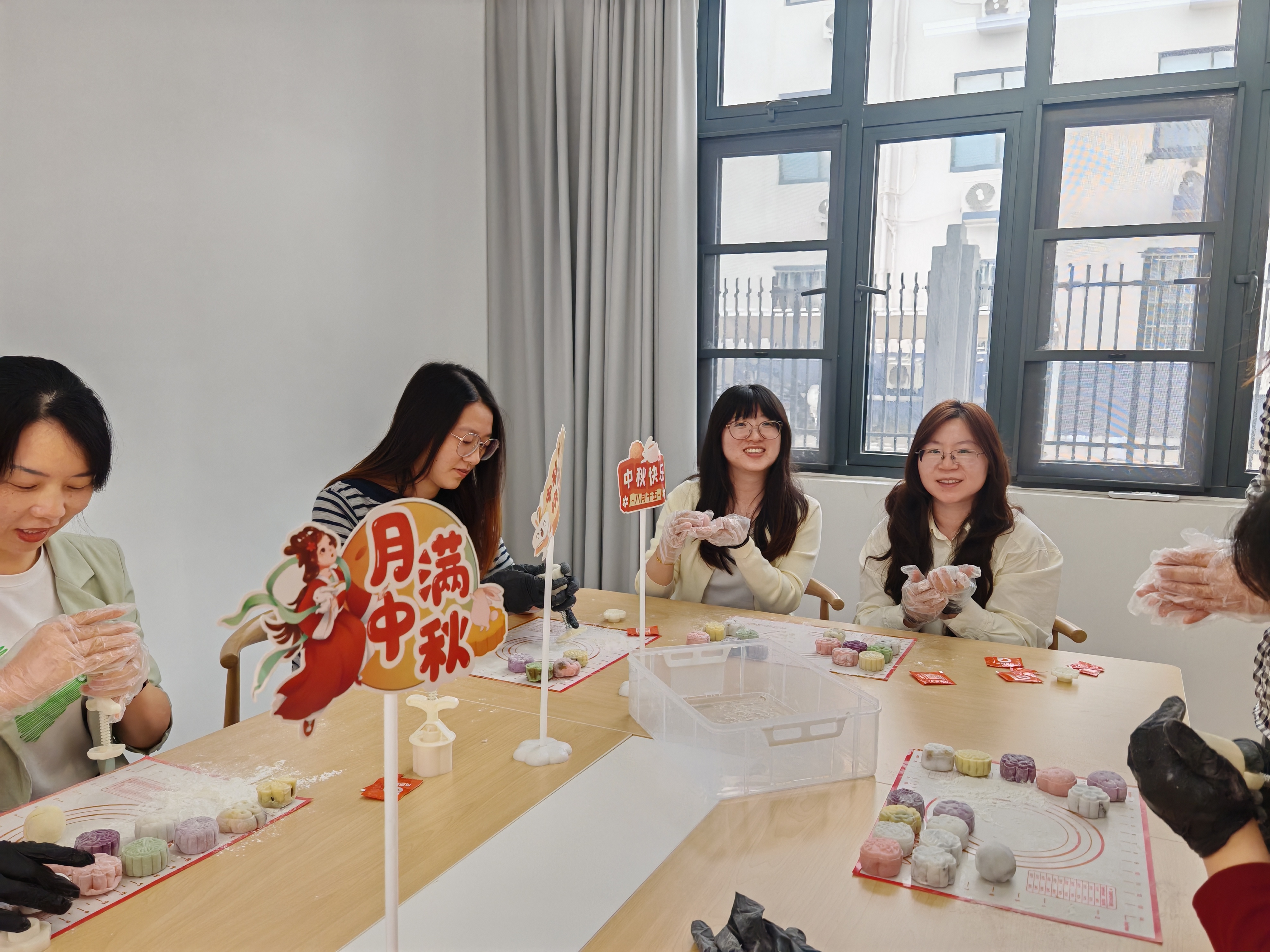 活动伊始,实践所工作人员详细讲解了冰皮月饼的制作步骤,随后大家便跃跃欲试,大家一起揉制面团、称馅料,包馅塑形,然后再小心翼翼地将包好的月饼放入模具中按压,脱模后,印有玉兔、桂花、月亮等图案的月饼便呈现在眼前。豆沙的醇厚、水蜜桃的清甜、抹茶的清香交织在一起,不同颜色、不同口味的冰皮月饼摆满了桌面,大家互相展示着自己的作品,脸上洋溢着成就感。