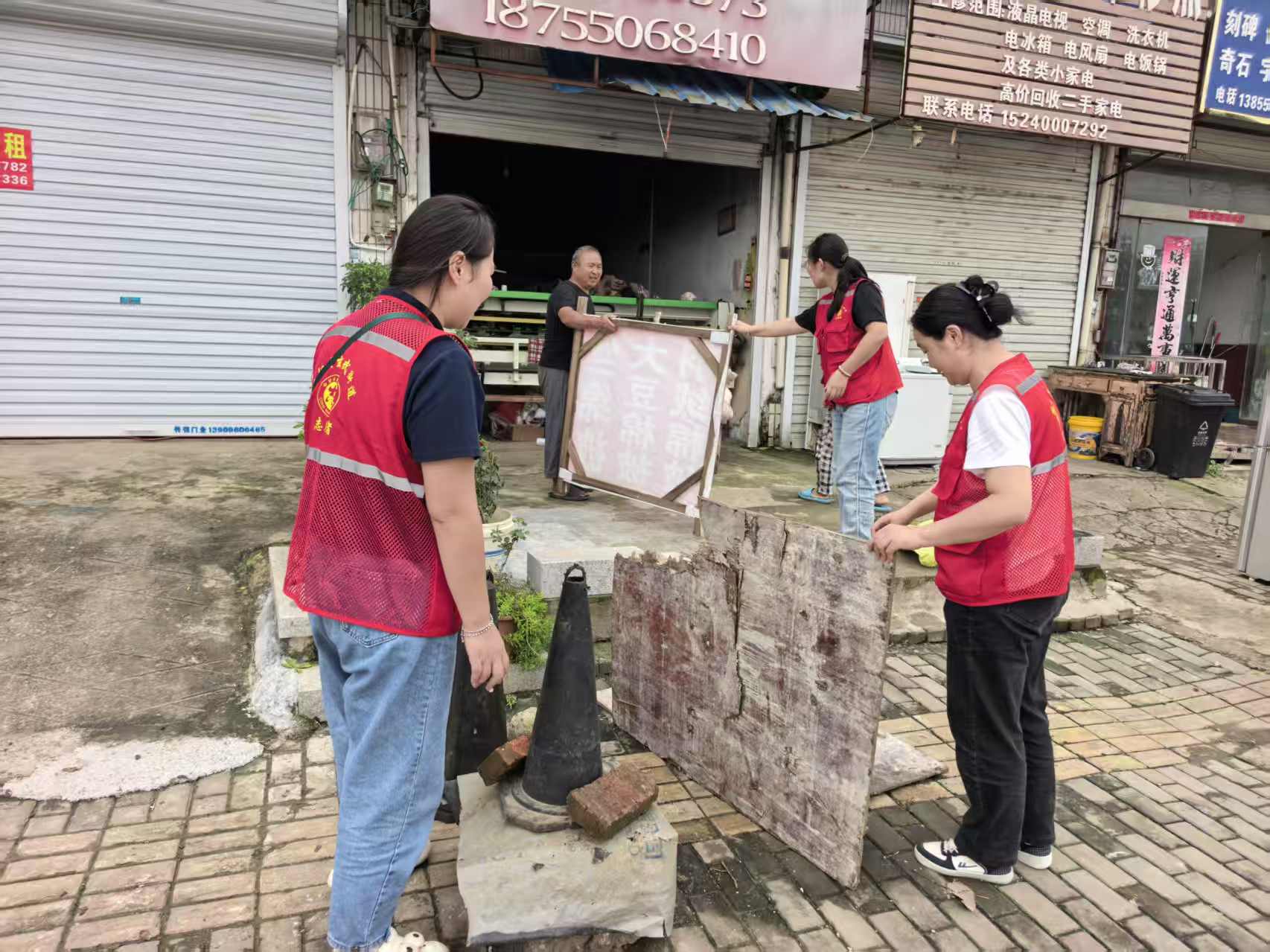 在集中攻坚层面,社区干部与志愿者组成专项整治队伍,聚焦社区街里两侧“老大难”问题开展行动。针对影响社区整洁的建筑垃圾,志愿者们分工协作,使用工具逐一清理、集中转运,彻底消除路面“视觉污点”。针对出店经营现象,工作人员耐心与商户沟通,讲解人居环境整治要求,引导商户主动将商品、货架搬回店内,规范经营秩序,同时协助商户清理店外堆放的杂物,还原社区街上路面宽敞整洁的公共空间。
