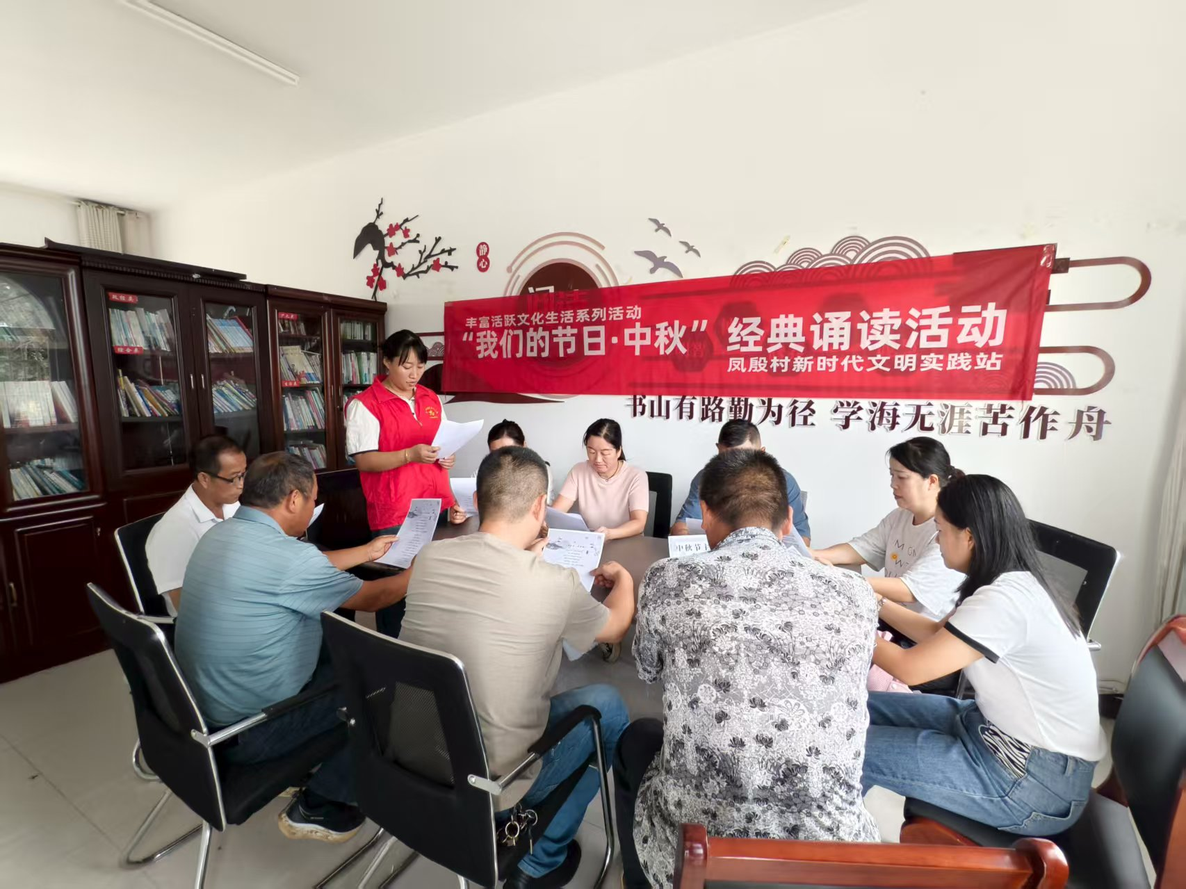 赓续文脉,以书香涵养文化根基 为推动优秀传统文化与阅读活动深度融合,殷涧镇以传统节日为契机,以丰富多彩的活动,续写文化传承新篇章。其中在国庆中秋双节同庆期间,凤殷村农家书屋率先开展“我们的节日・中秋”经典诵读活动,村民共聚一堂,吟诵《水调歌头・明月几时有》《静夜思》等诗词,在书香中品味节日内涵,激发文化认同;古塘村农家书屋则推出“‘阅’圆中秋 书香国庆”主题活动,设置自由阅读、经典朗诵、文化分享等环节,让村民在品读中秋习俗与爱国文学作品的过程中,既感受传统文化魅力,也凝聚起深厚的家国情怀与乡村向心力。