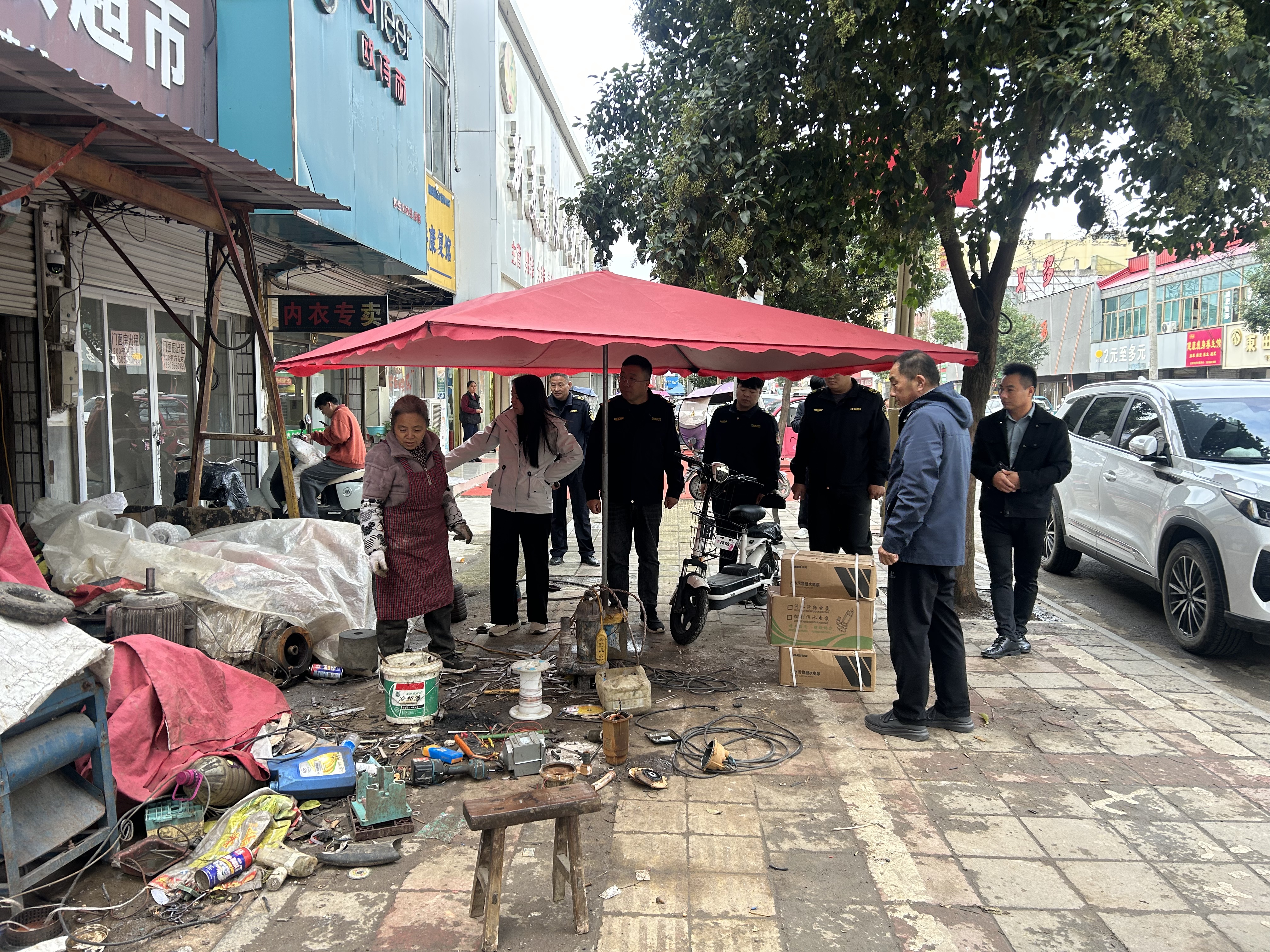 针对镇区内电动车停放秩序问题,整治小组对随意停放在人行道、盲道乃至机动车泊位上的电动车进行了规范整理,积极引导车主将车辆有序停放在指定区域,并对现场车主进行宣传教育,倡导文明停车风尚。同时,对于沿街商铺广告牌设置不规范、存在安全隐患或影响市容观瞻的情况,工作人员逐一进行检查,要求商户对破损、陈旧以及违规设置的广告牌进行维护或拆除,做到设置安全、美观整齐。