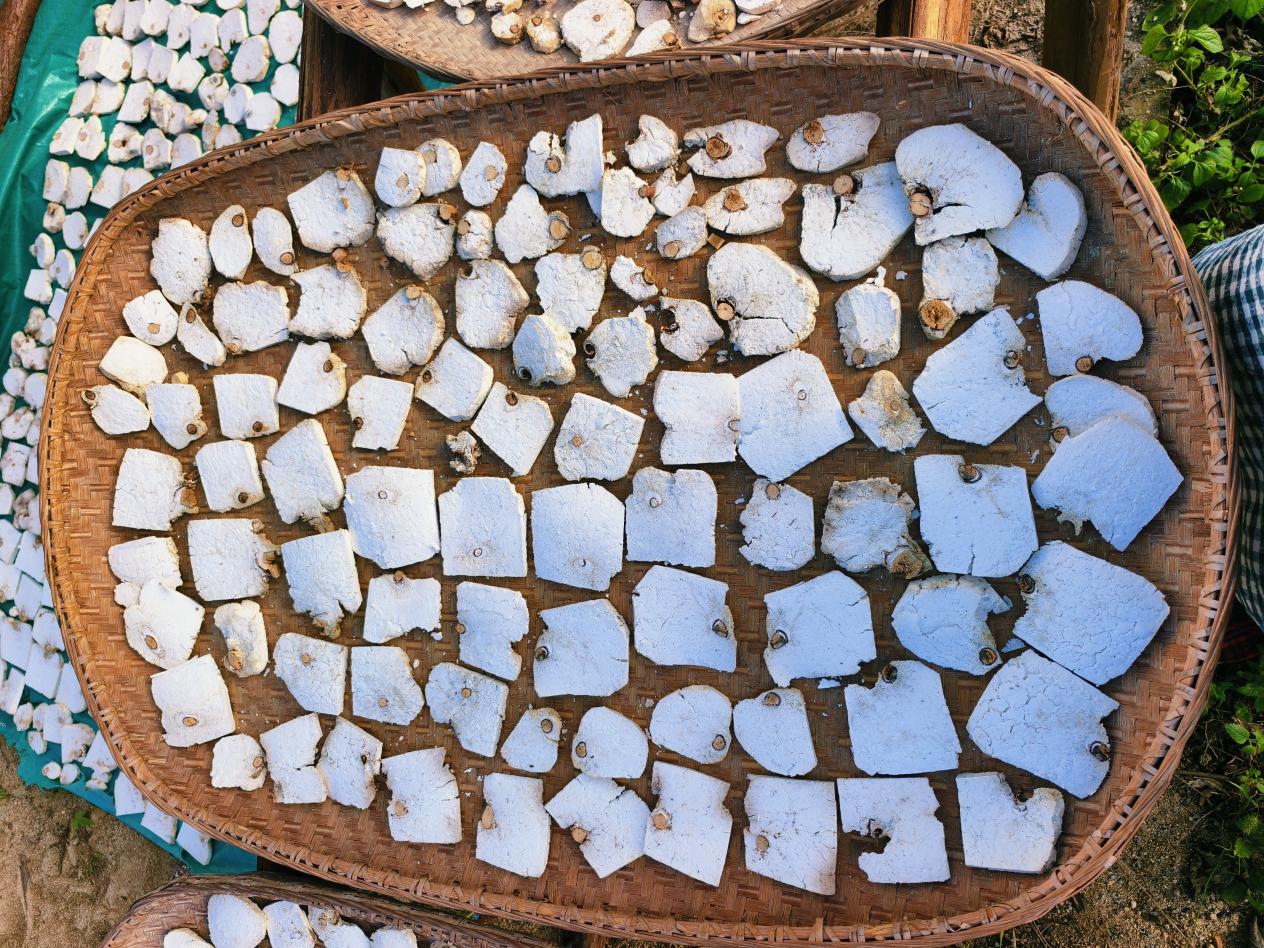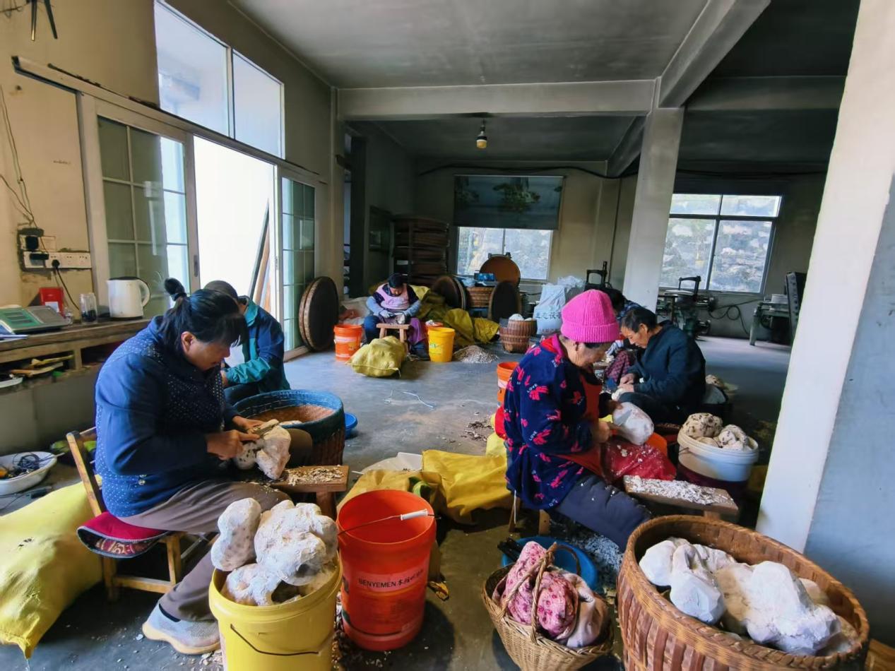 闵山村素有茯苓加工的传统,每到秋冬季节,村里十几户加工户便陆续开工,专门收购本村及周边乡镇的鲜茯苓。从筛选鲜货到把控加工流程,加工户们始终坚守“地道”二字,拒绝外来茯苓掺杂,确保每一份产品都保留岳西茯苓的原汁原味。据统计,全村每年仅茯苓加工就需收取鲜货约50万斤,加工出的茯苓丁、茯苓片、茯苓神等产品远销各地,同时还能吸纳周边四五十人就业,让村民在家门口就能实现增收。