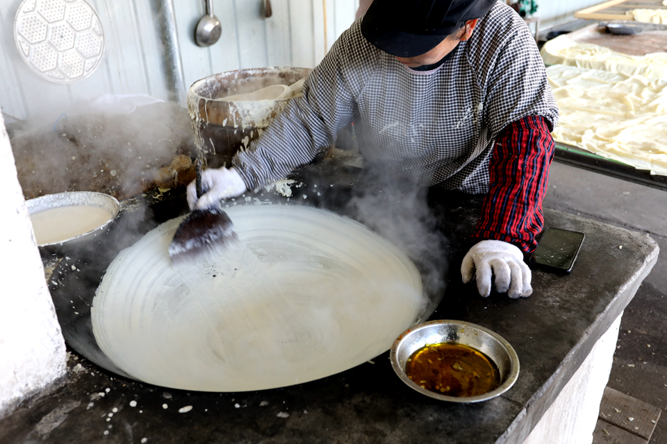 豆粑是岳西的特产,由大米混合绿豆、黄豆等,经浸泡、磨浆、烫制、切丝、晾晒等多道工序制成的丝状食品。其名字形象地概括了它的形态:“豆”点名主料,“粑”则再现了米浆在锅中烫成薄饼的过程。店前镇豆粑的纯手工制作技艺,承载着农耕记忆和邻里乡情,被列为县级非物质文化遗产。