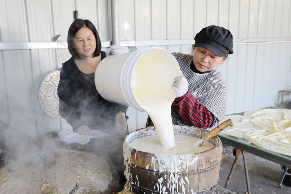 “我们今年从10月初就开始加工豆粑,平均每天生产200公斤左右,全年销售豆粑1万公斤,带动了许多周边村民务工增收。”店前镇杨胜村村民程玉平说。