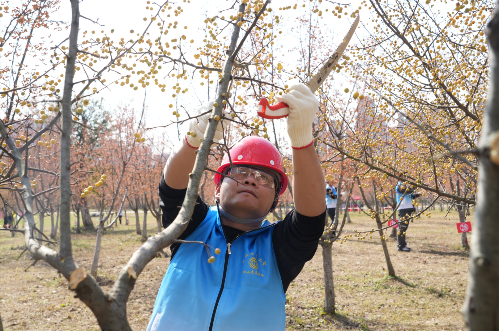 记者在现场看到,选手们都带着高枝剪、压力剪、手锯、手剪等工具,修剪之前先绕树观察,再用剪刀或手锯将病残枝、多余枝去掉……很快,原本略显杂乱的海棠树便露出了别样风采。