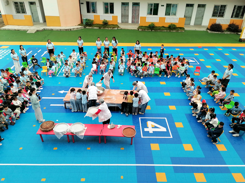 活动中,6名阿姨现场展示了传统美食重阳糕的制作过程。孩子们认识了蒸笼、筛子等传统工具,观摩了熬糖、搓粉、蒸制等步骤,并在指导下亲手尝试搓粉,感受传统手工艺的魅力。