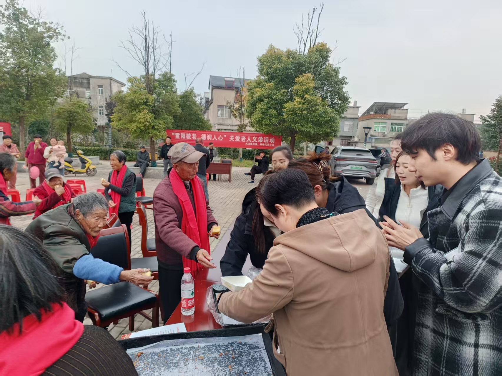 在文艺演出现场的另一边,还开展了“重阳敬老 德润人心”关爱老人活动,为老年人测血压,宣传健康知识。老人们在观看演出的同时,也增强了健康意识。此外,镇村干部还为现场老人发放了爱心礼物。