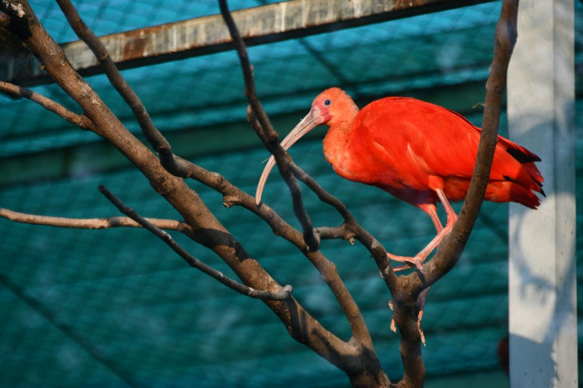 美洲红鹮的 “胭脂色方阵” 则成为摄影爱好者的新宠。20余只羽毛鲜红的红鹮栖息在仿沼泽湿地中,与远处的火烈鸟群形成色彩呼应。“它们的羽毛颜色比火烈鸟更浓郁,是因为食物中虾青素含量更高。” 来自周口的摄影师王先生说,“为了拍她们,我特意多玩了半天,这抹红色在镜头里太惊艳了!”
