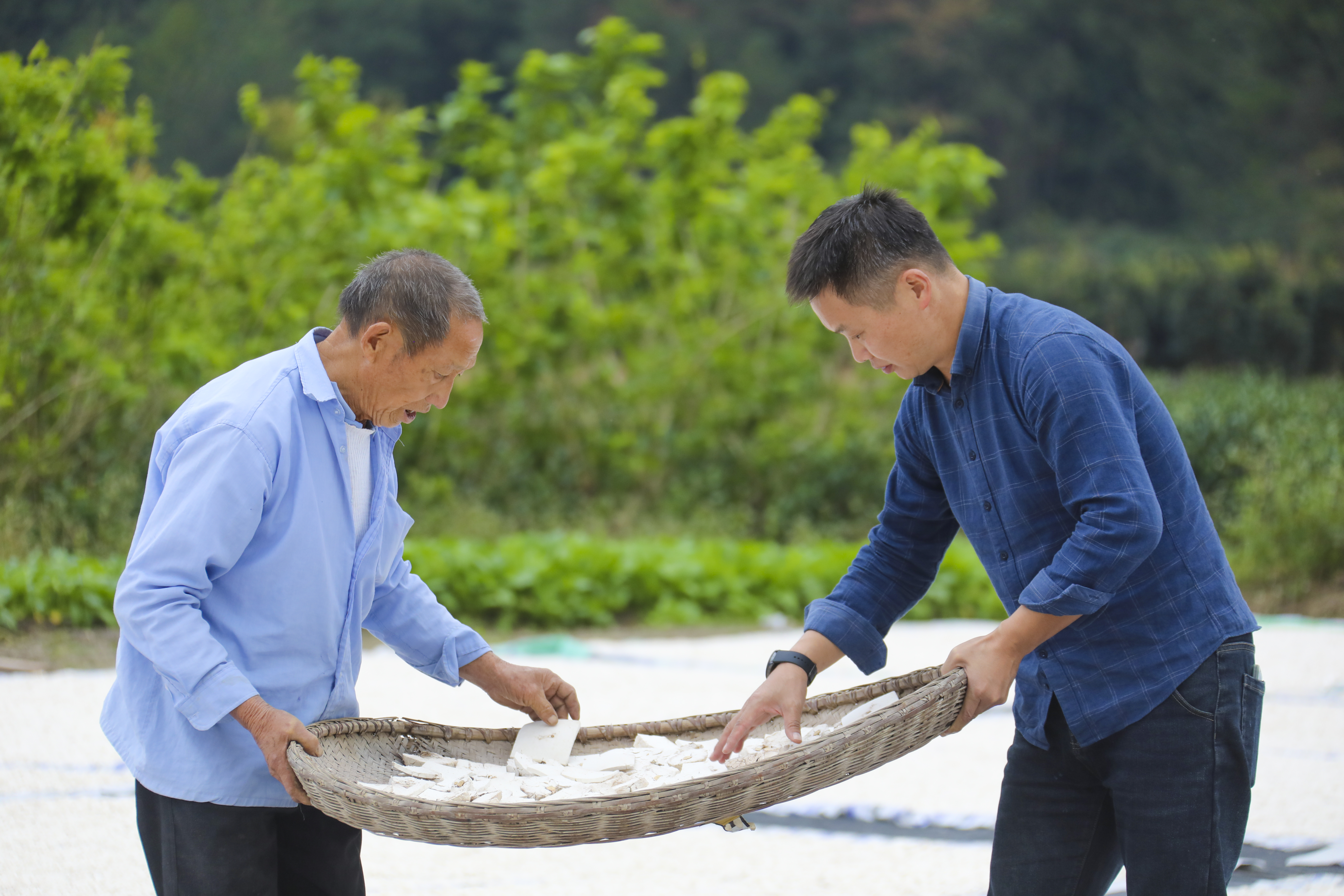 11月2日,在岳西县来榜镇黄泥村,村民正在晾晒茯苓、讨论收成。