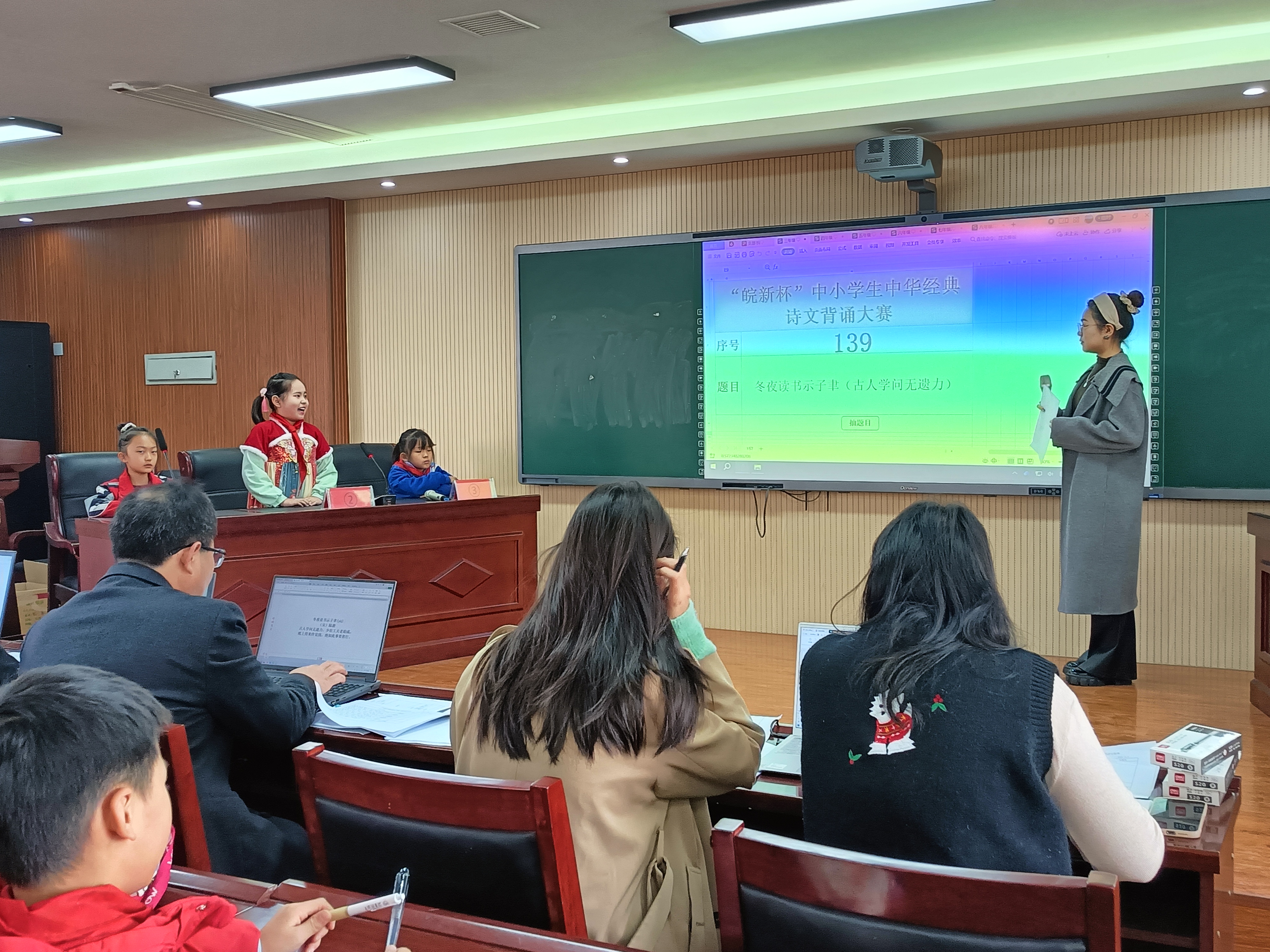 第二阶段以现场背诵形式进行,参赛选手现场背诵电脑抽签指定的中华经典诗文全文或片段。比赛现场气氛热烈,选手们用稚嫩而坚定的声音,诵读着一篇篇经典诗文,他们以清晰的吐字、饱满的情感,将“床前明月光”的柔情、“天生我材必有用”的豪情演绎得淋漓尽致,赢得在场师生阵阵掌声,充分展现了中小学生对传统文化的浓浓兴趣和积极向上的精神风貌。