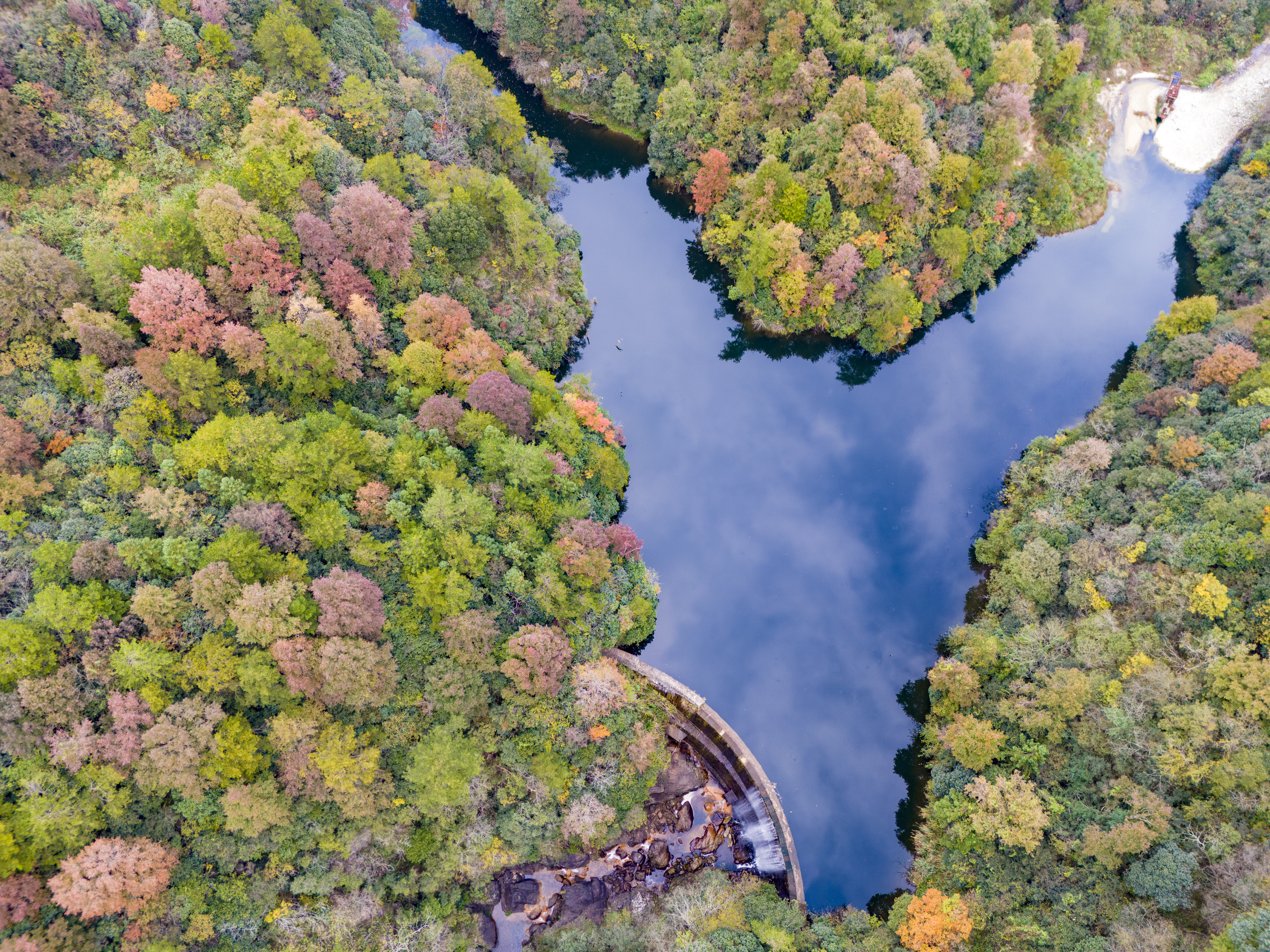 11月2日,安庆市岳西县河图镇南河村,漫山秋叶五彩斑斓,与山间溪涧相互映衬,美如画卷。(熊凤霞)