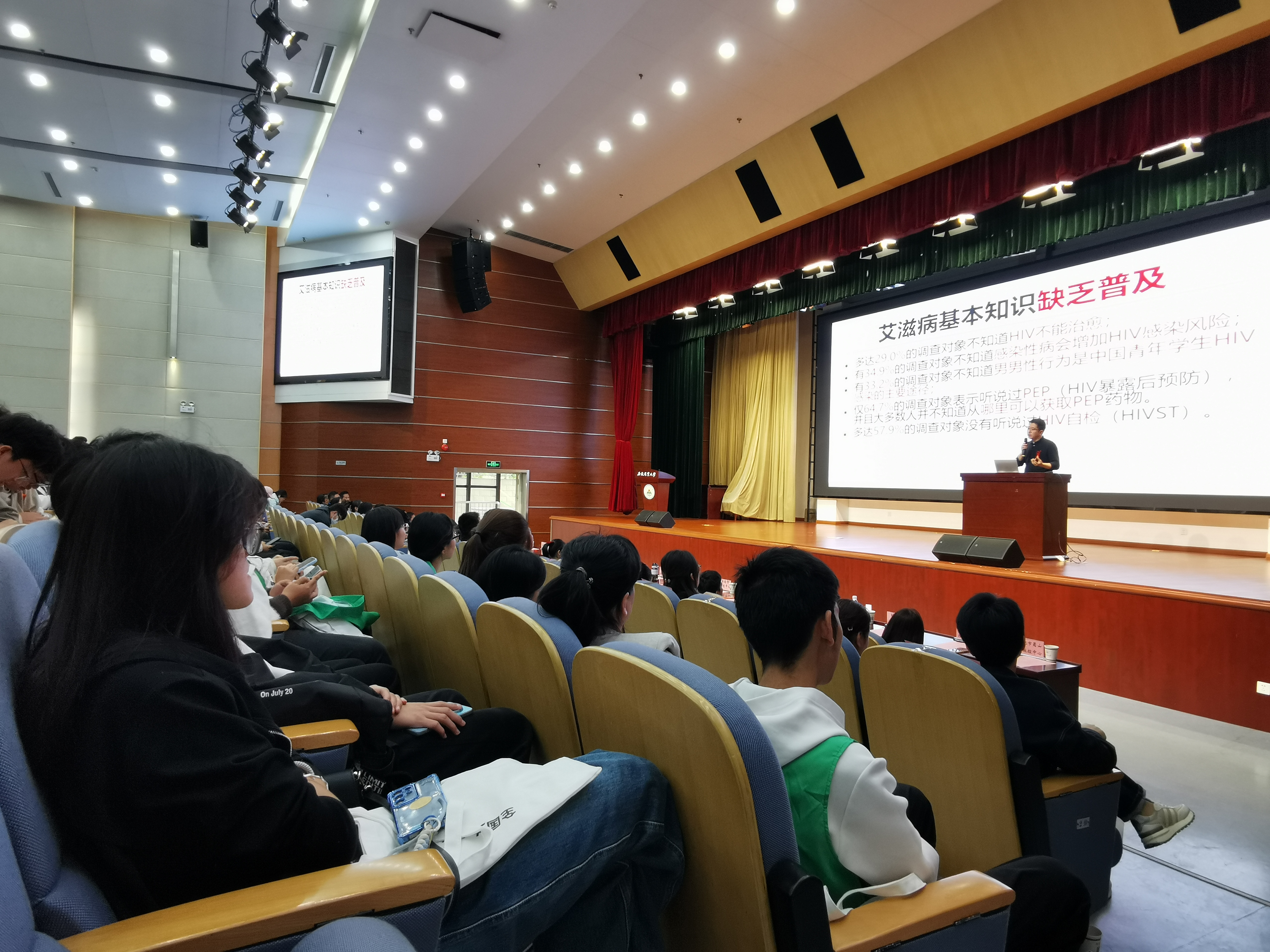 活动上,省疾控中心艾滋病与性病预防控制所所长张进为同学们做了一场以“远离艾滋,绽放多彩青春”为主题的防艾知识科普讲座,并开展防艾知识互动竞答,同学们踊跃参加答题,合肥市疾控中心、蜀山区疾控中心专家分别为同学们进行专业点评和解读。同时,安徽农业大学校医院设立防艾知识宣教台,医护人员为同学们解答防艾相关问题,发放防艾知识宣传册页1000多份。
