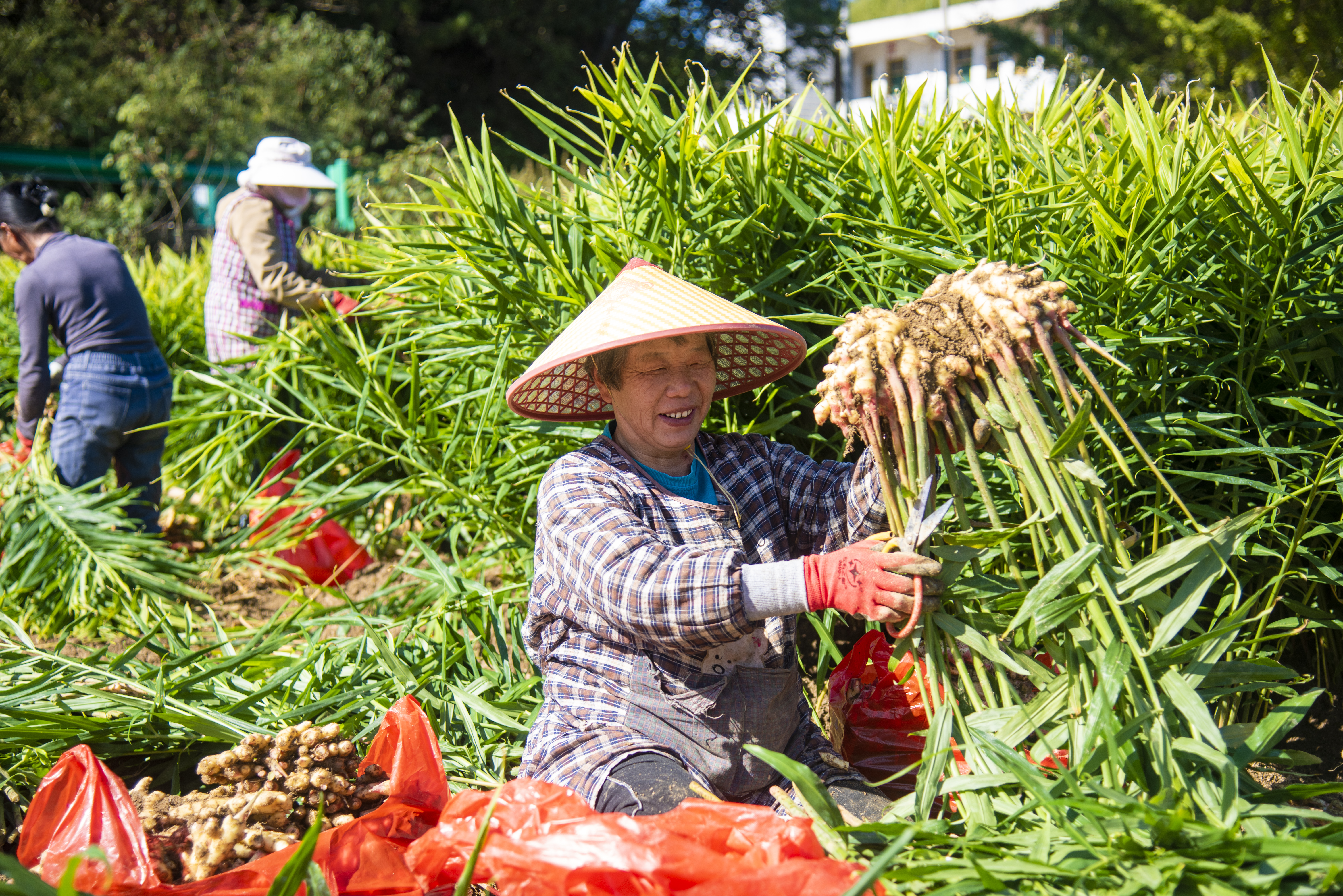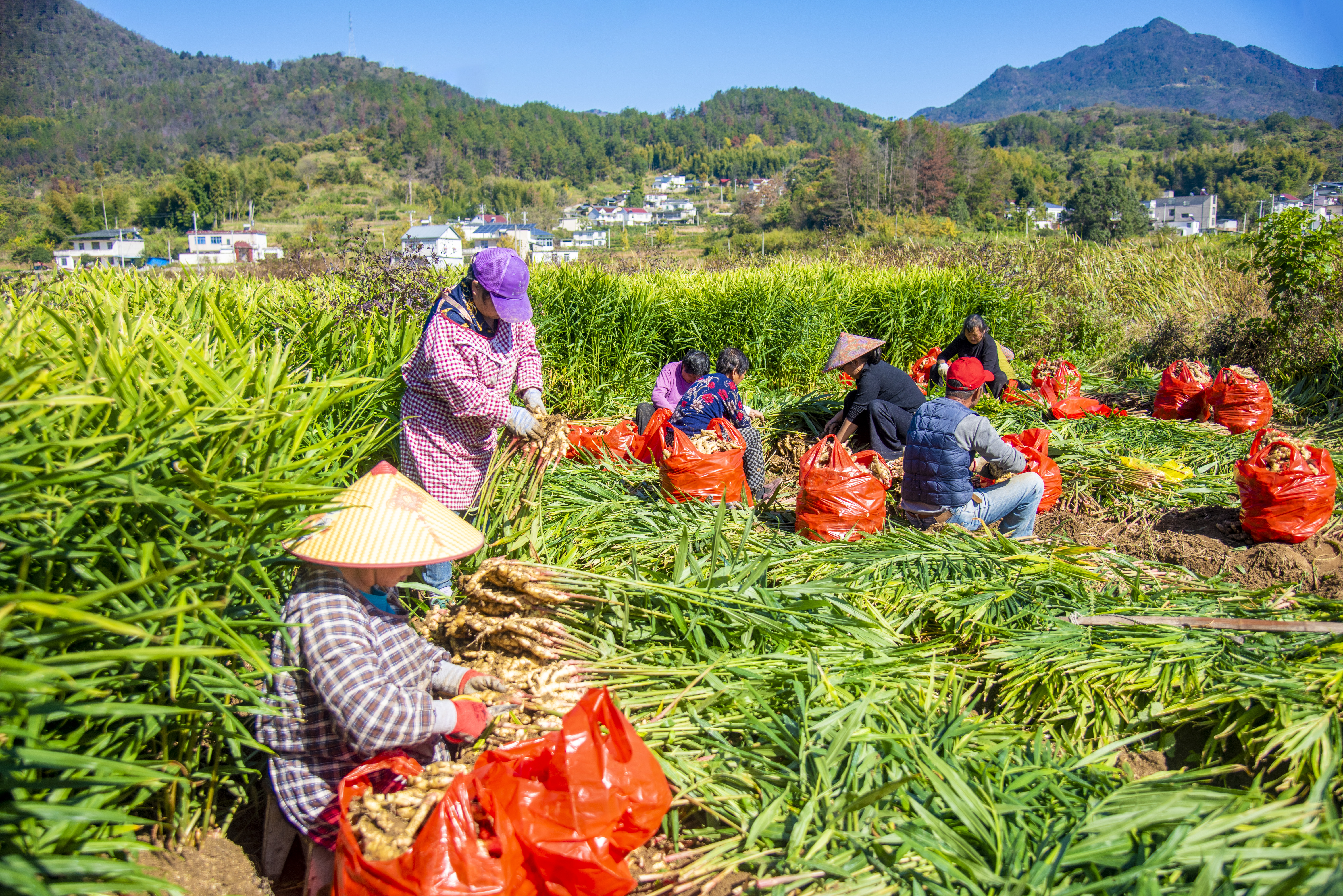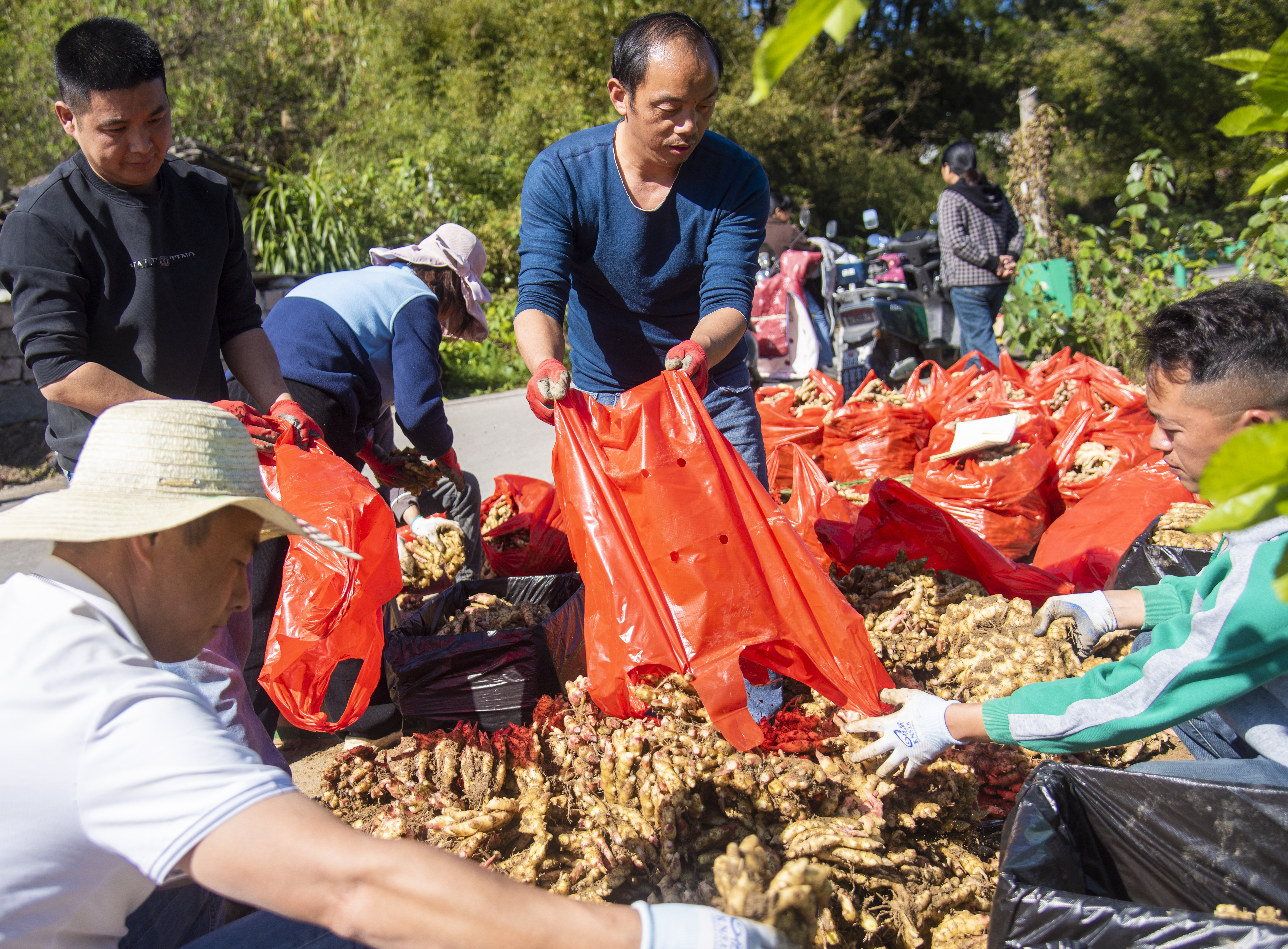 11月5日,在安庆市岳西县温泉镇榆树村,村民们在采收、打包“订单生姜”,供应市场。(熊凤霞)