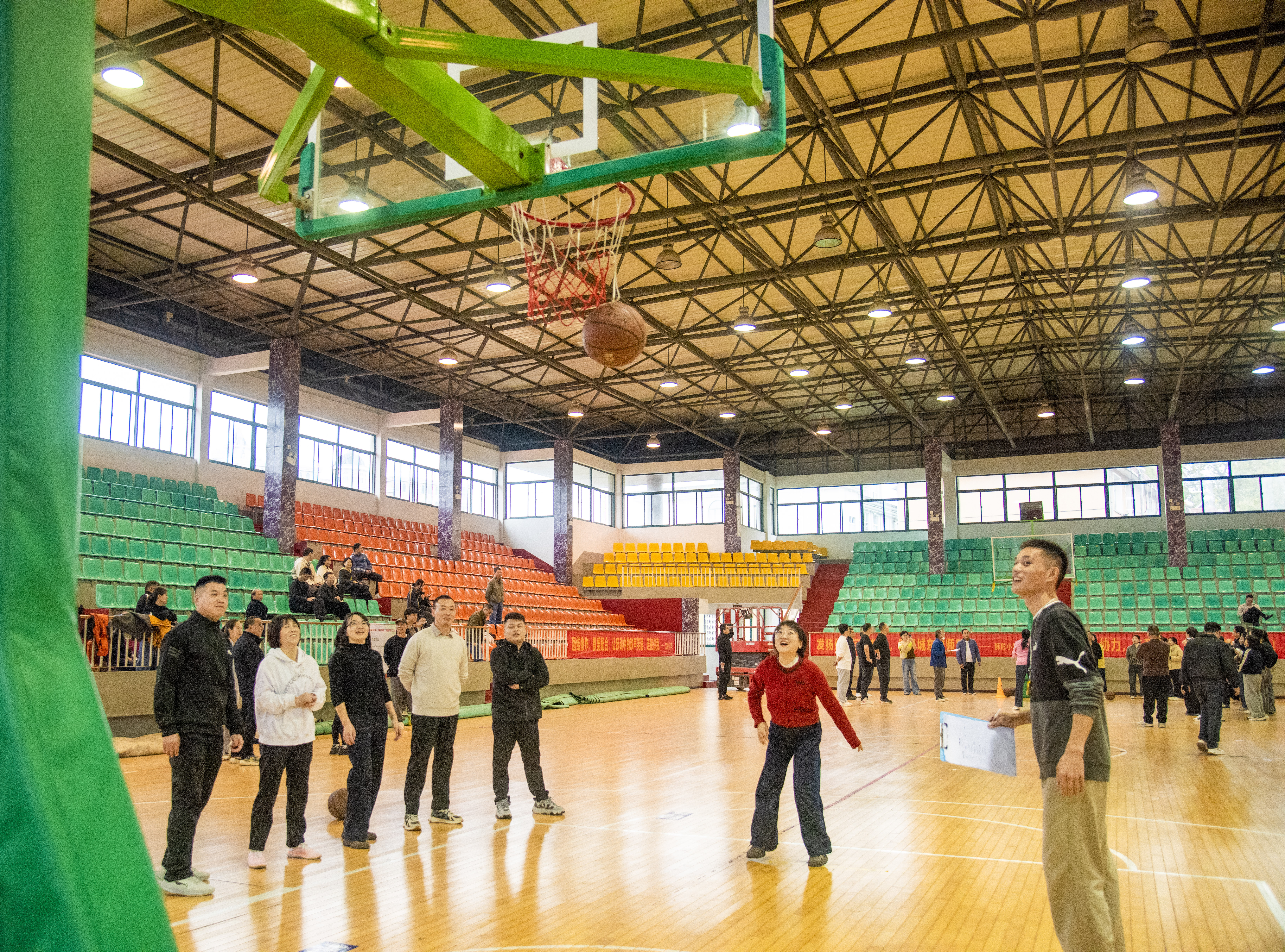11月7日,岳西县老岳中体育馆,职工在进行拔河比赛。