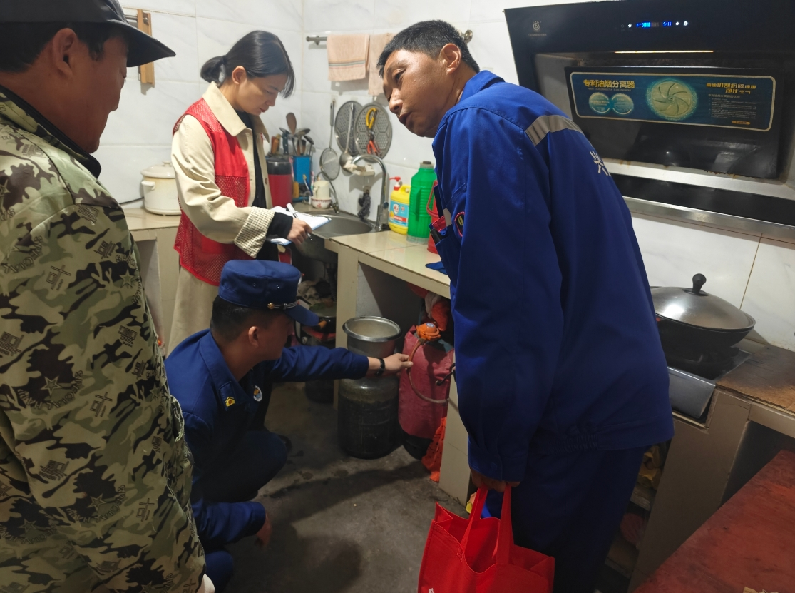 排查现场随处可见工作人员的忙碌身影,各部门排查人员深入居民厨房细致核查设施,消防队员紧盯液化气钢瓶有效期,辖区液化气站技术人员俯身检查厨房管道密封性与接口安全,穿红马甲的工作人员则手持台账,逐项记录隐患细节,将“安全关”把到群众生活一线。