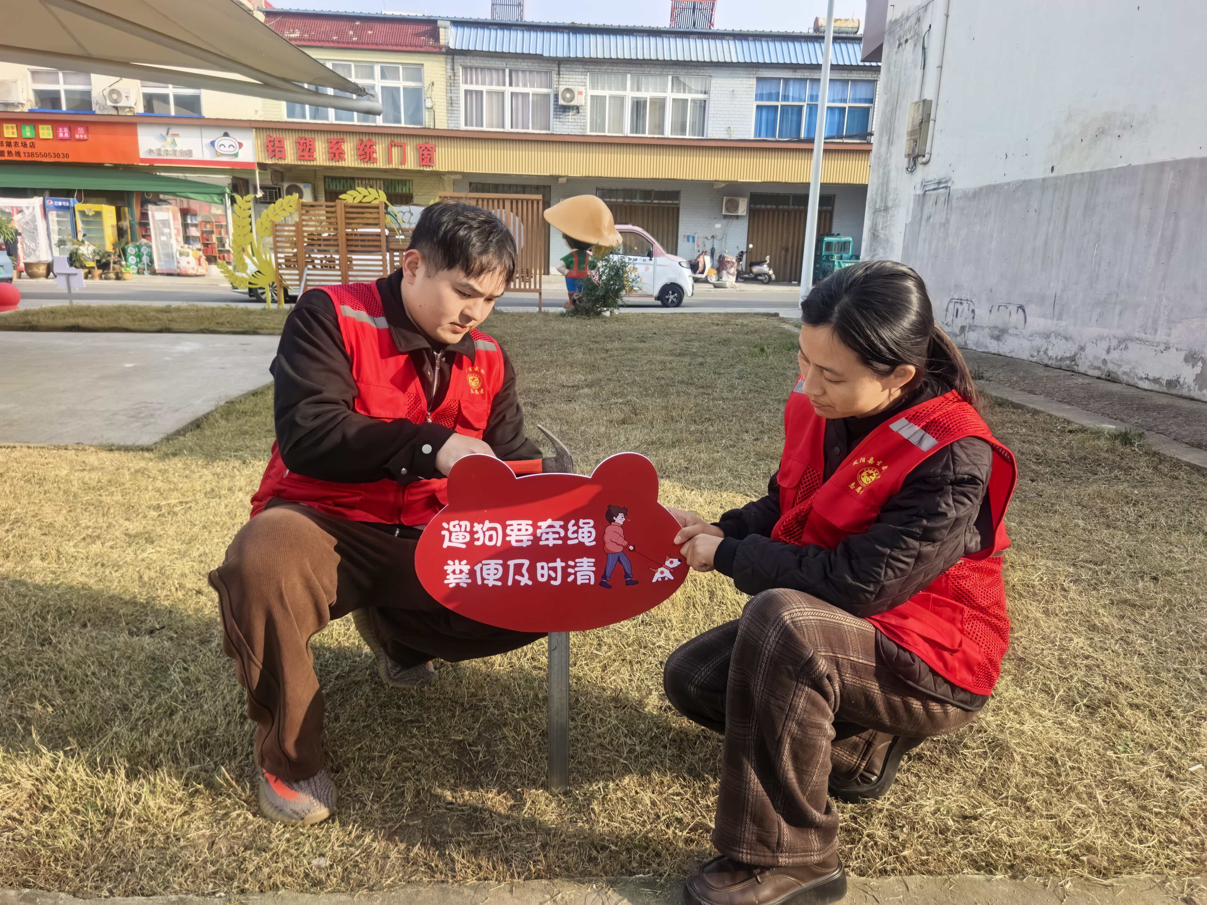 除了入户宣传,社区还推出多项务实举措,全方位引导居民规范养犬行为。在小区广场、绿化带出入口等公共场所,设流动宣传点,现场演示拾便方法、解答疫苗接种等疑问,用通俗语言传递文明养犬知识。针对居民反映较多的狗狗乱拉、乱叫、不栓绳等问题,专门设计制作文明养犬提示牌,插在各个网格人流量大、位置显眼的区域,以无声的视觉提醒强化居民规范意识。提示牌内容聚焦高频问题,单元楼门口提示牌“制止狗狗乱吠,守护邻里和谐”,小区大广场提示牌“遛狗请栓绳,粪便随手清”。
