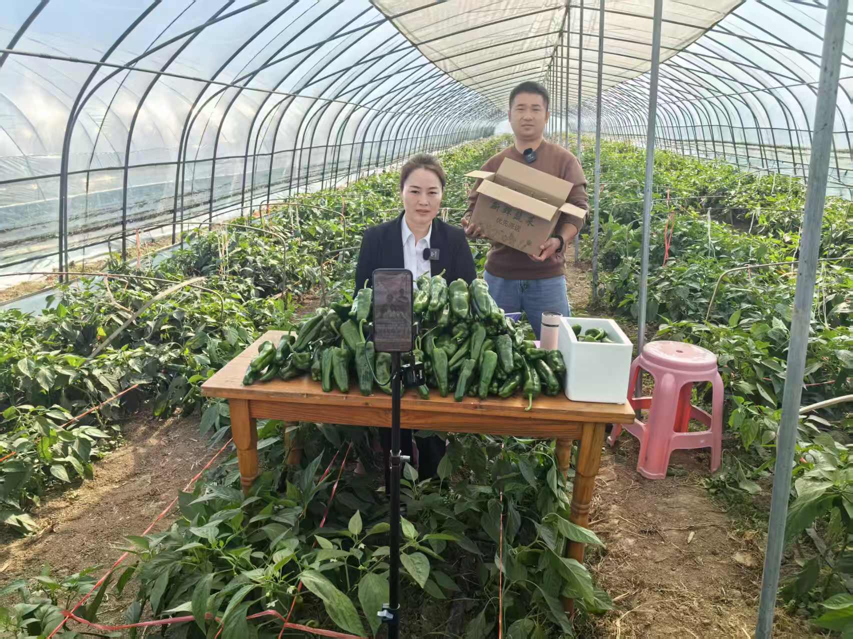 近日,走进凤阳县刘府镇苍张村的蔬菜大棚,映入眼帘的是一片生机勃勃的翠绿。一株株青椒苗长势旺盛,饱满的果实挂满枝头,空气中弥漫着清新的椒香。与往年不同的是,今年在这片希望的田野上,多了一道别样的风景——村党支部书记正站在田垄间,对着手机屏幕,热情洋溢地为村里的青椒“代言”,一场别开生面的公益助农直播正在这里火热进行。