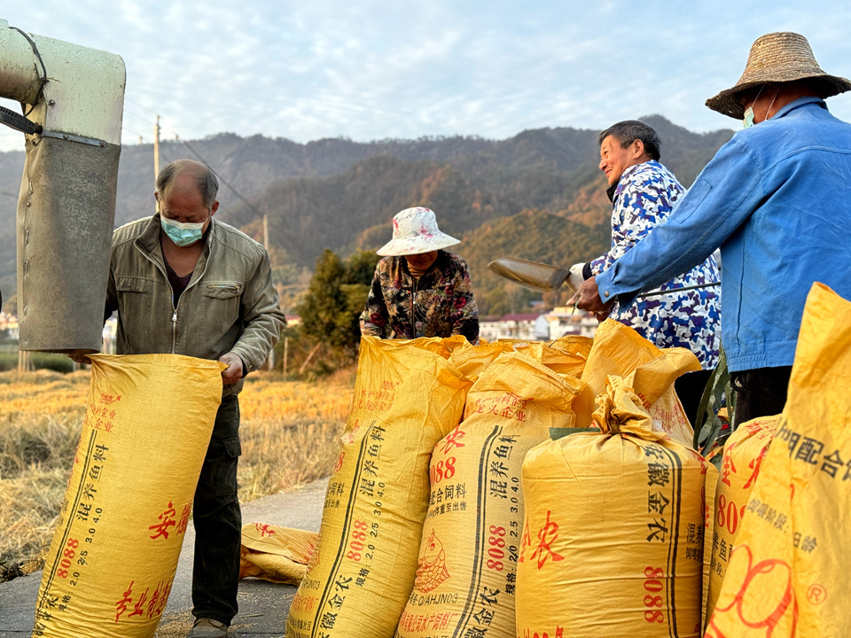 初冬时节,岳西县店前镇杨胜村水稻种植基地里,连片稻田翻涌着金色的波浪。伴随着收割机的轰鸣声,一排排水稻被卷入机械,切割、脱粒、粉碎秸秆等工序一气呵成,一派丰收景象。