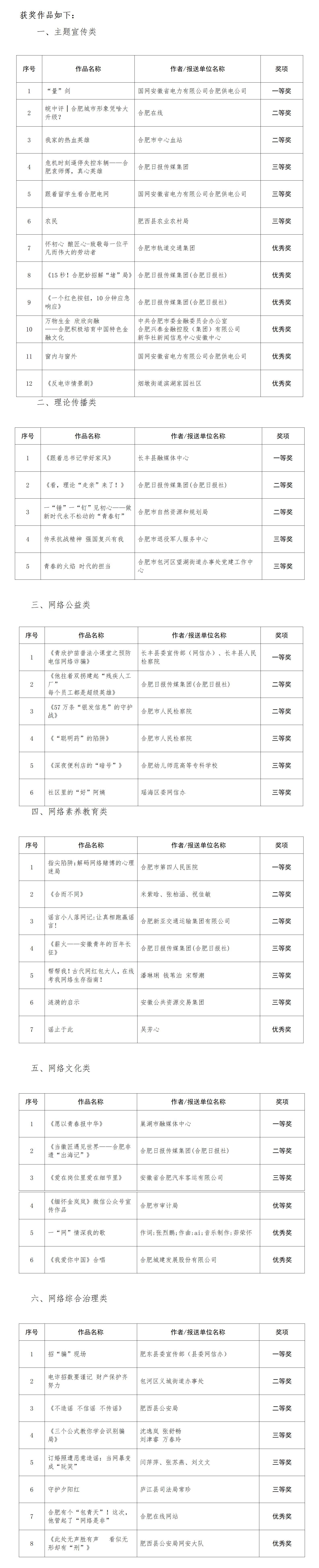 其中,《“量”剑》《跟着总书记学好家风》等6件作品获一等奖,《我家的热血英雄》《《合而不同》等11件作品获二等奖,《“聪明药”的陷阱》《三个公式教你学会识别骗局》等15件作品获三等奖,《谣止于此》《15秒!合肥妙招解“堵”局》等9件作品获优秀奖,一批网络文明践行者用作品为城市网络文明建设写下了生动注脚。