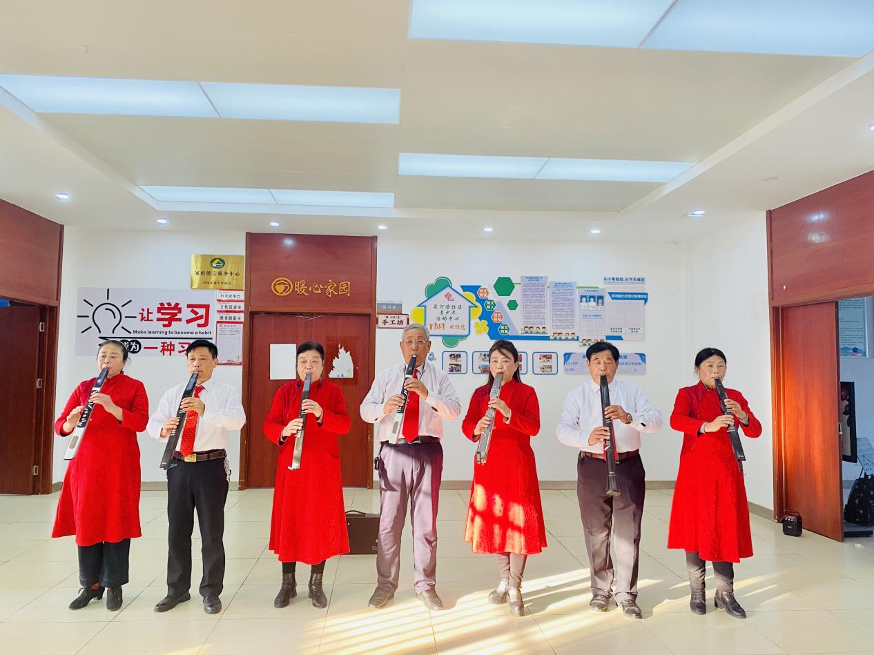 演出伊始,电吹管合奏《红歌联奏》便以新颖的演奏形式抓住了观众的眼球。七位演奏者中,年龄最大的张大爷已过古稀,他握着电吹管的手却稳健有力,“这乐器学起来不容易,但大家凑在一起排练、演出,越玩越有劲儿!”谈及演出,他脸上满是自豪。乐声时而激昂、时而舒缓,将《映山红》《我和我的祖国》等经典旋律演绎得别有风味,为演出奠定了热烈的基调。紧接着,交谊舞《盛世霓裳》团队登场,大家默契配合,旋转、摆臂、踏步,每一个动作都精准流畅。领舞的李阿姨是团队的组织者,“我们每周固定排练三次,不为别的,就为了把最美的姿态留在舞台上,也留在自己的生活里。”裙摆翻飞间,尽显老年人对优雅与活力的追求。充满民俗气息的伞扇舞《水乡情韵》则将江南水乡的温婉灵动展现得淋漓尽致,演员们手持蓝绸伞与彩扇,一颦一笑都透着传统民俗文化的独特韵味。此外,情景剧《邻里情》、女声合唱《红梅赞》《沂蒙颂》、女声独唱《在希望的田野上》、手鼓表演《红山果》等节目轮番登场,声乐、舞蹈、戏曲、器乐各展所长,让舞台精彩纷呈。
