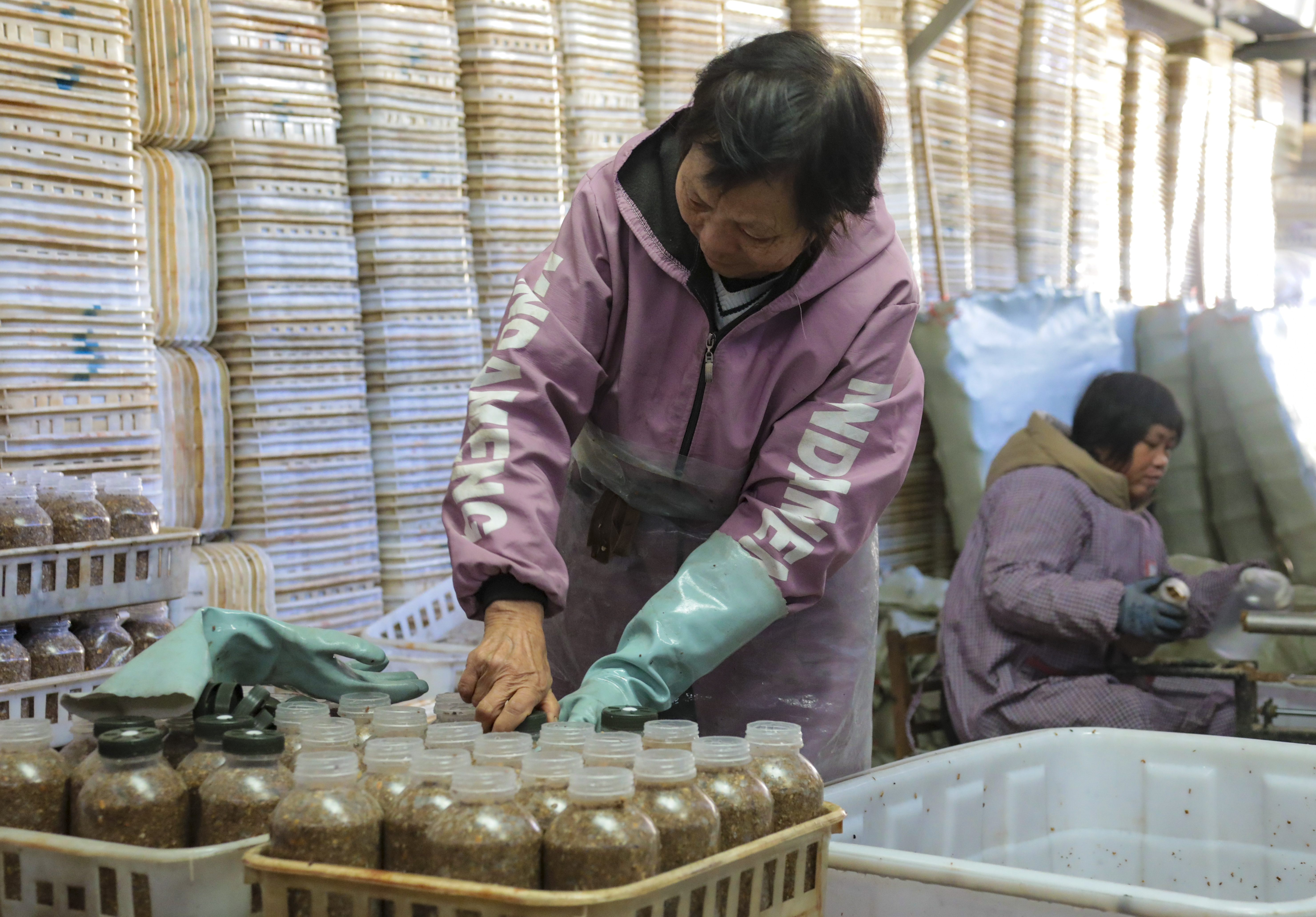 小雪刚过,大别山腹地寒意渐浓,但安庆市岳西县莲云乡莲塘村的岳西县通真食用菌专业合作社内,却因此起彼伏的器械声、工人们的交谈声暖意融融。14名工人正围着操作台,娴熟地完成天麻菌种接种、装瓶、上架的全流程作业,近千篮封装整齐的“订单菌种瓶”在培养室码放如阵,等候菌丝饱满成熟后,发往湖北、河南及省内各地的中药材种植基地与农户手中。