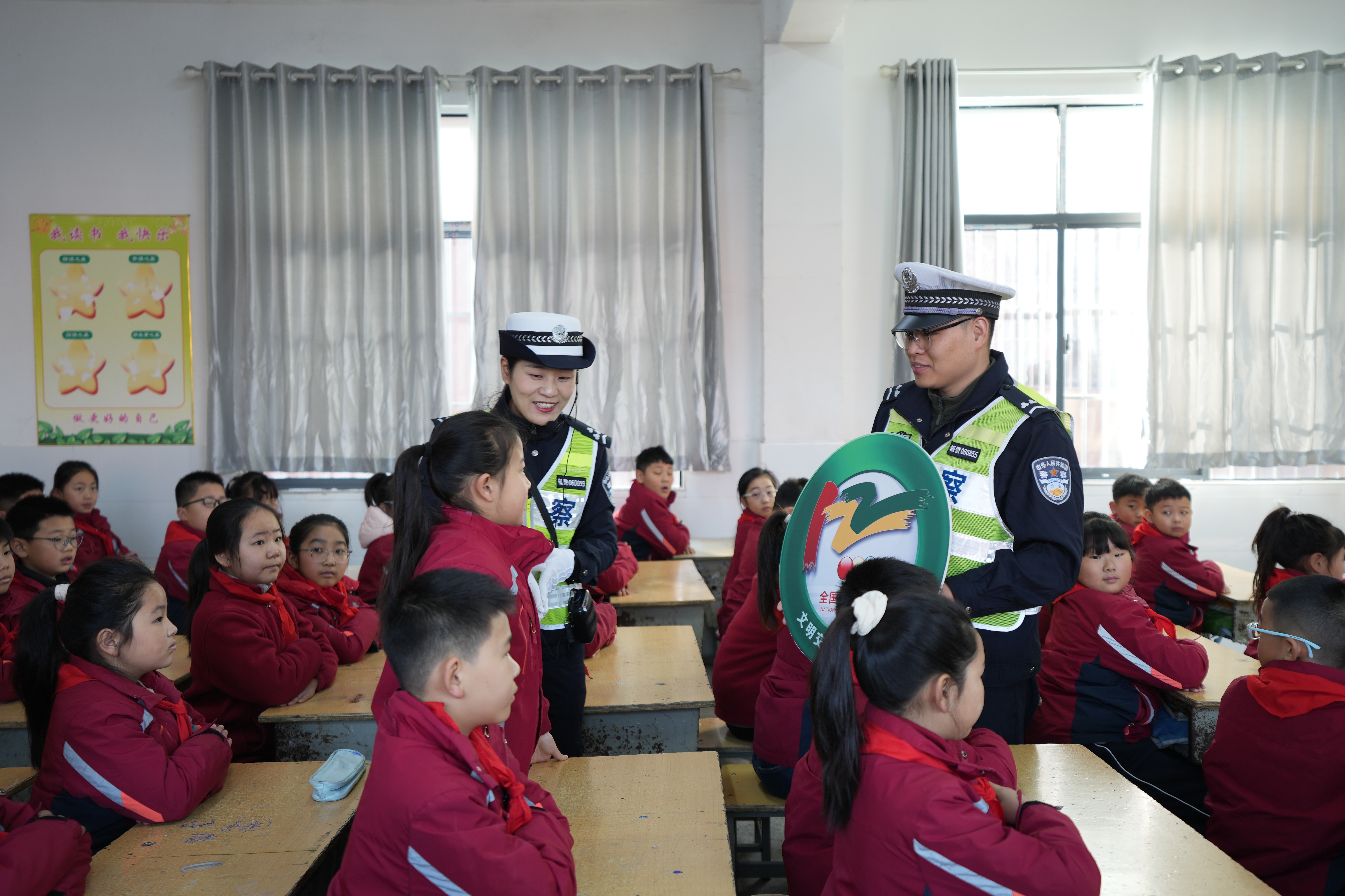 走进班级,宣传民警化身“安全老师”,围绕“过街走斑马线”“不在车辆周围玩耍”等关键内容展开讲解。警示视频中的真实案例,为孩子们敲响安全警钟;宣传海报前的逐一解说,让“一盔一带”“礼让行人”“警惕开门杀”等安全提示深入人心。“实线虚线斑马线,条条都是生命线”,民警通过朗朗上口的提示语,帮助孩子们将交规牢记心间。有奖问答环节气氛尤为热烈。“乘车时身体可以探出窗外吗?”“骑电动车必须佩戴什么?”同学们踊跃举手,积极应答。在互动中,安全知识悄然扎根。