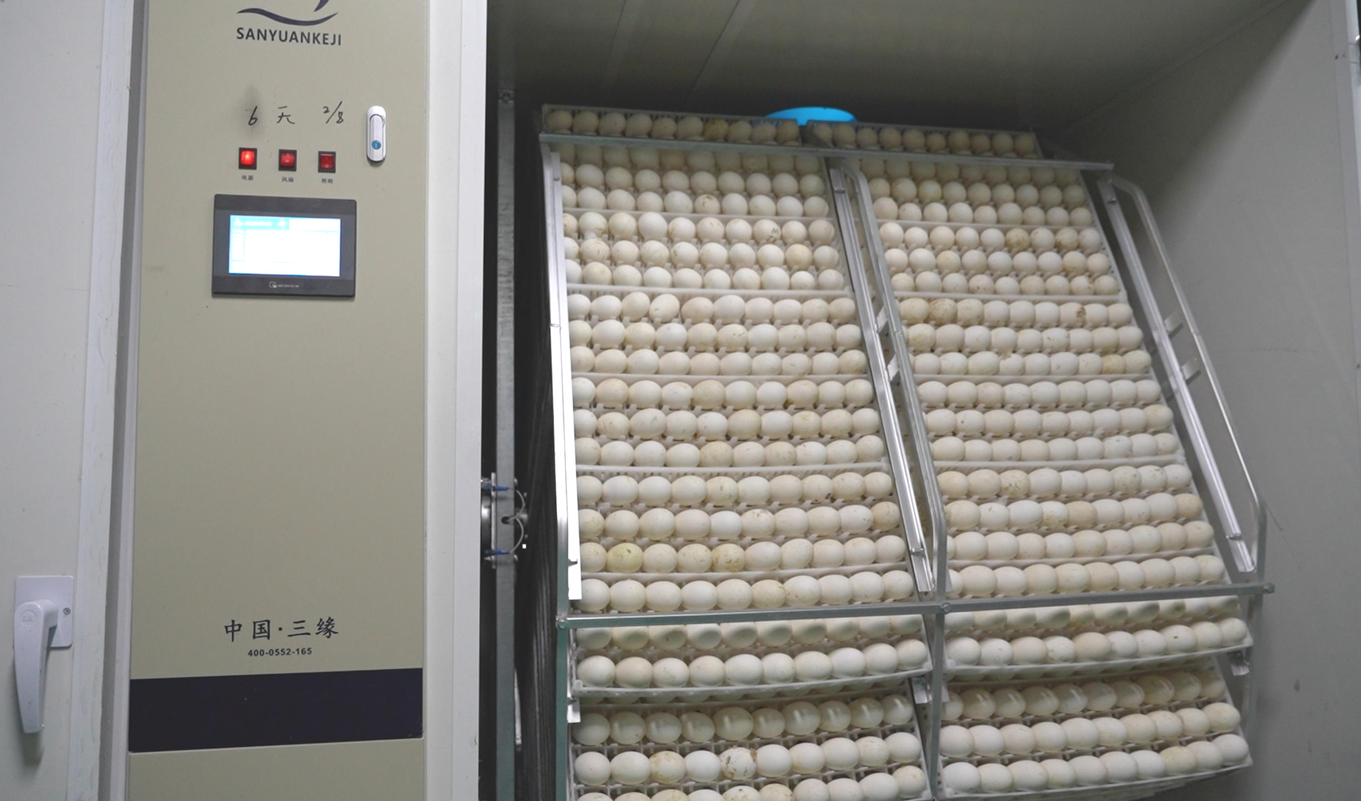 在白鹅的恒温孵化环节,可摆动的蛋框承载设备让每一枚蛋均匀翻动,避免胚胎组织与蛋壳内膜粘连,使得胚胎发育正常,提高孵化率和雏鹅质量;均匀加热装置让孵化箱内温度流动起来,确保同一批种蛋的出壳时间趋于集中,降低弱雏出现的概率。科学高效的自动化设备使年产鹅苗千万羽孵化车间,管理运营仅需要6-8位工人。