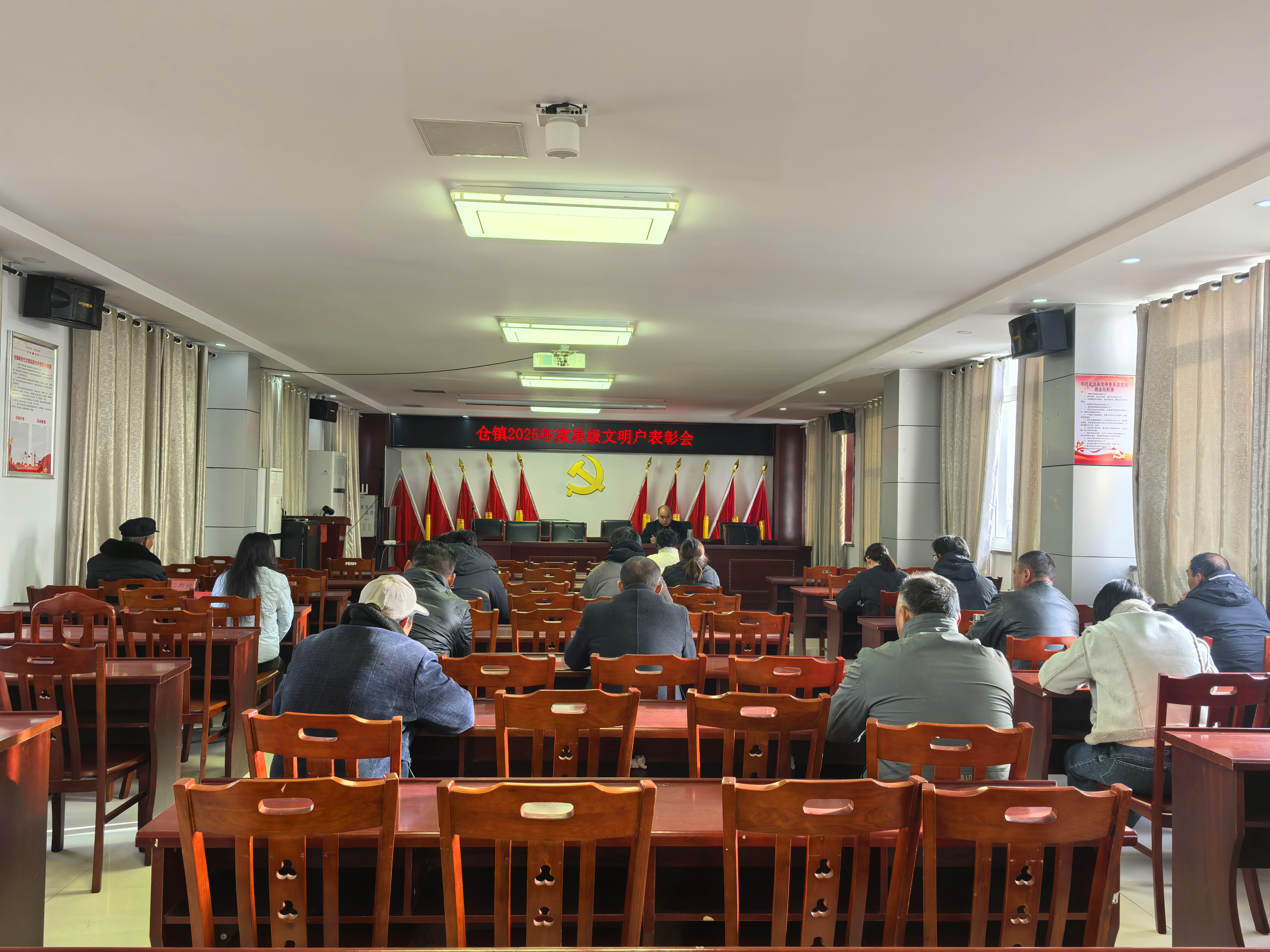 近日,定远县仓镇召开2025年度星级文明户表彰会议,全镇各村居宣传员、受表彰家庭齐聚一堂,共同见证文明荣光。
