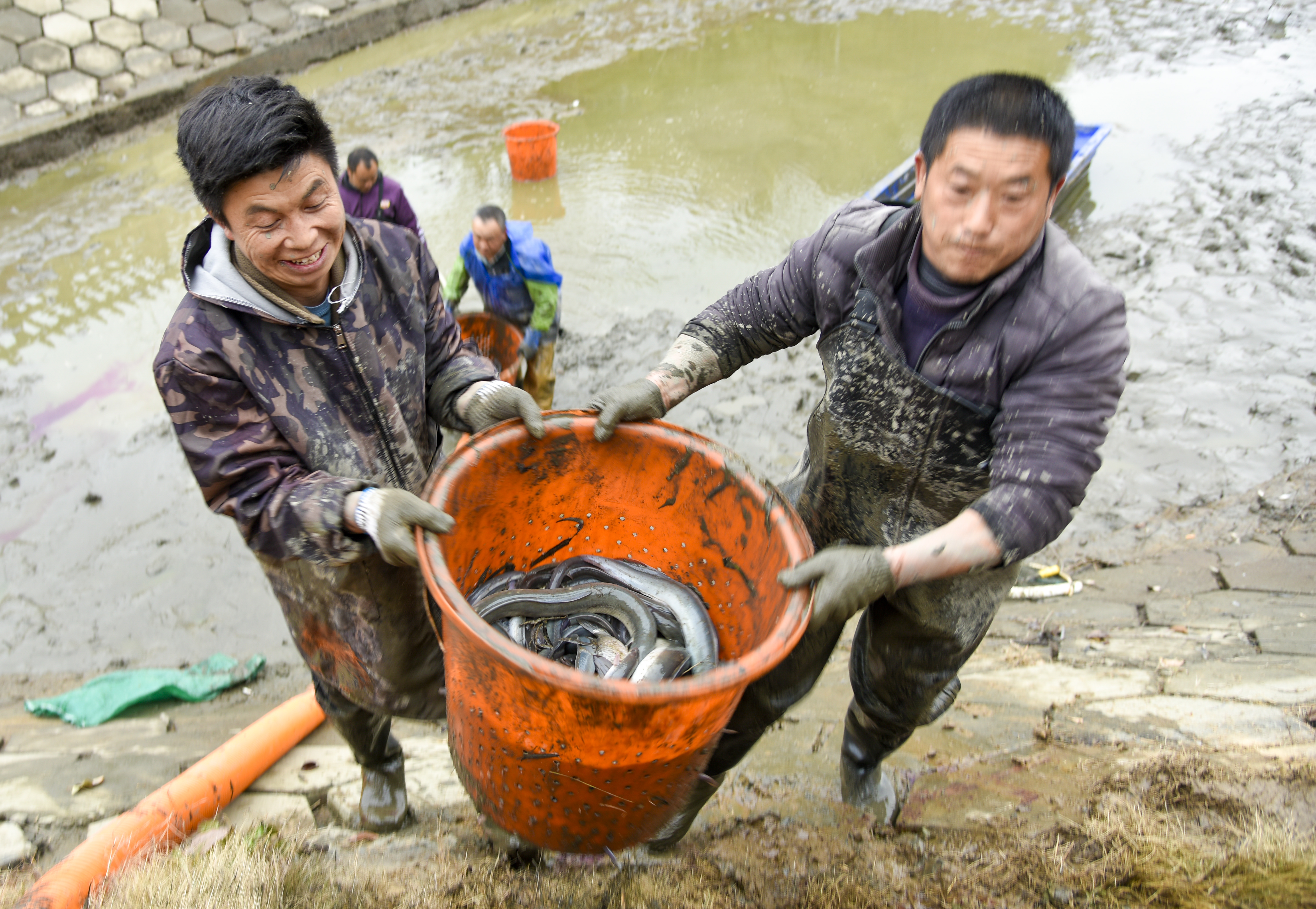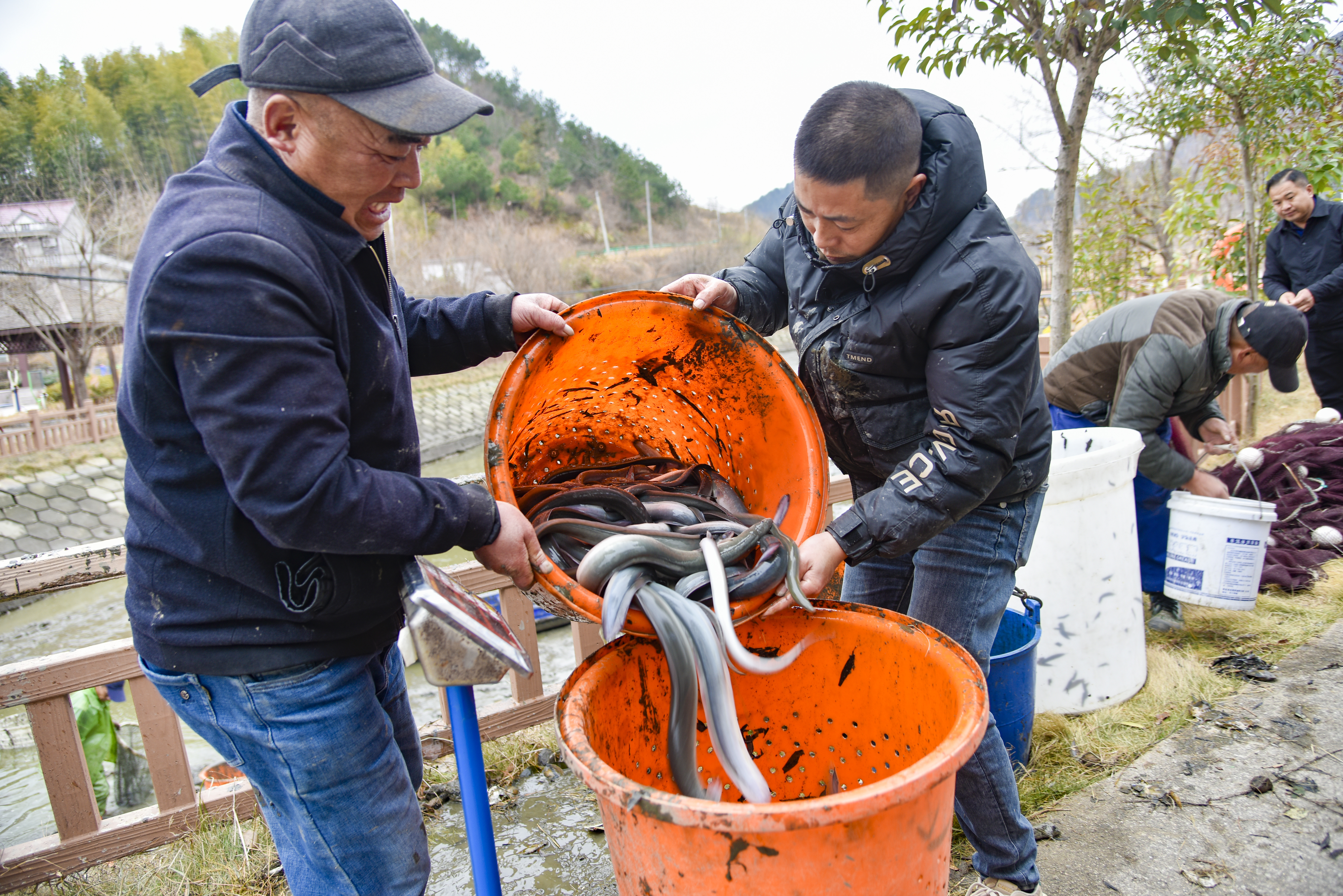 丰收现场,工人正按大小分拣鳗鱼,准备发往生鲜企业和星级酒店。“鳗鱼又称蛇鱼,高蛋白,市场价四五十元一斤,我们纯生态养殖的品质更受市场青睐。”与村里开展合作的福建老板介绍。此次3吨鳗鱼总产值将破30万元,为连续两年获评县集体经济“十强村”的象形村再添新突破。