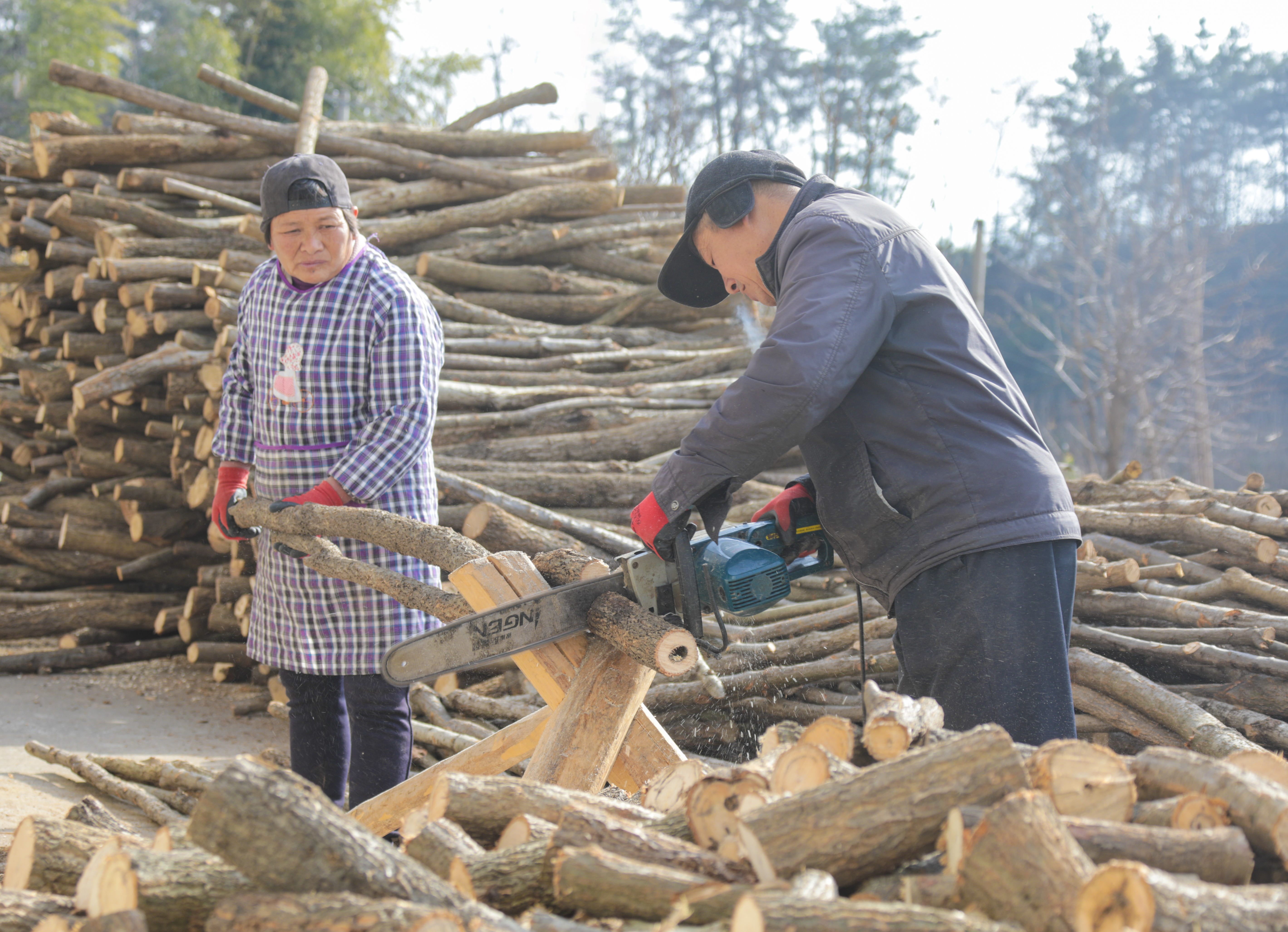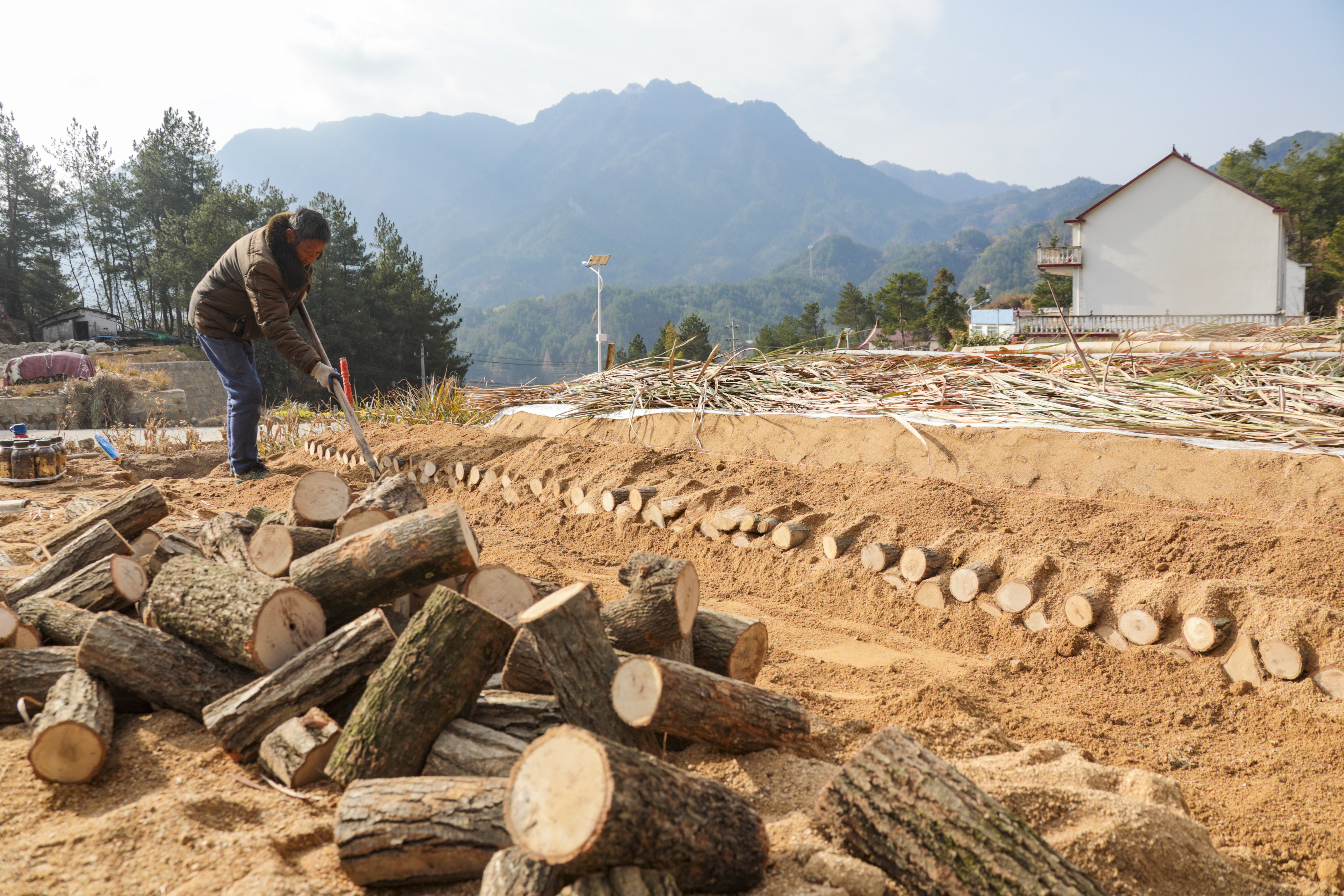 12月13日,岳西县来榜镇清潭村,村民们正忙着锯木材、备菌材、窖天麻,田间地头一派繁忙景象。