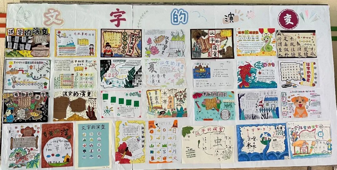 一幅幅作品,不仅是美术创作,更是孩子们主动探究、理解文化的过程。他们在查找、描画、排版、装饰中,不仅锻炼了综合能力,更建立起对汉字的亲密感与敬畏感。孩子在“做中学”,在“画中悟”。这次活动,孩子们用眼睛观察、用双手重现了文字的演变,这份体验远比单纯背诵知识点更为深刻。他们笔下的,不仅是汉字的历史,更是文化传承的种子。