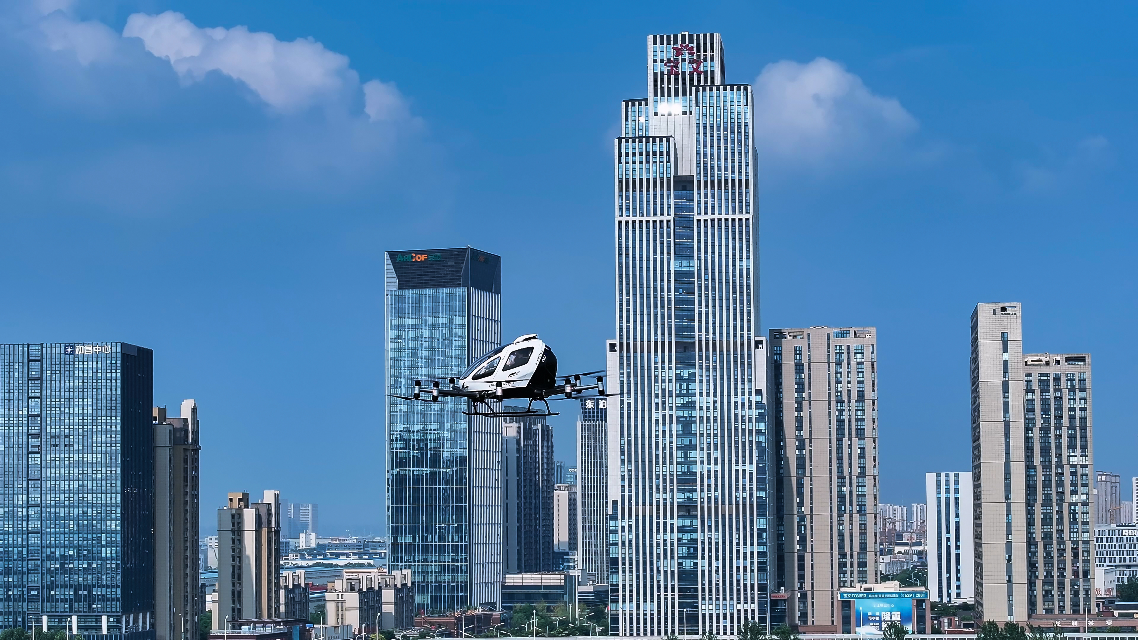 合翼航空运营的EH216S无人驾驶载人航空器在合肥上空飞行。
